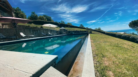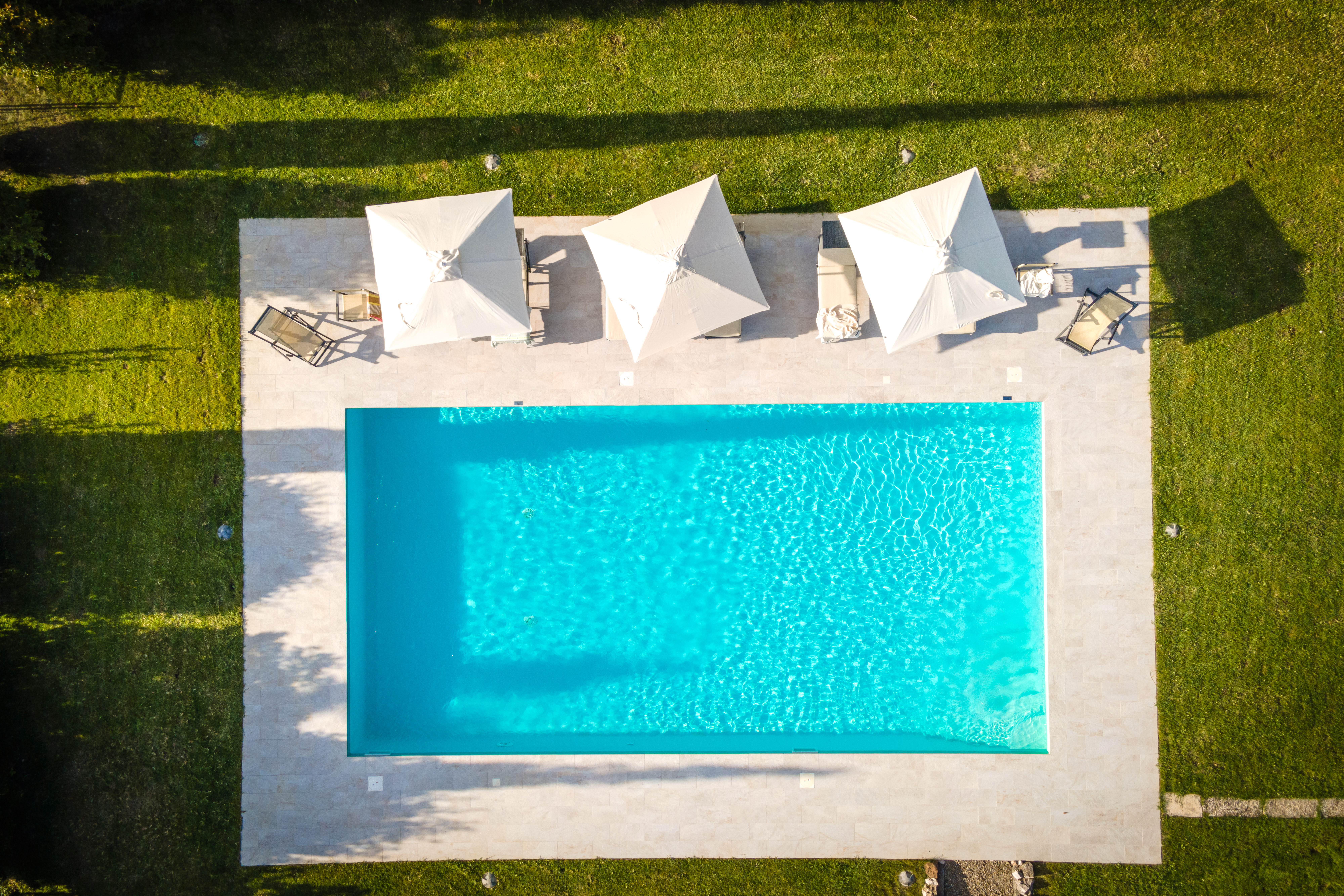 The swimming pool is nestled at the end of the garden; it has a big solarium well equipped with umbrellas, sun beds and loungers.