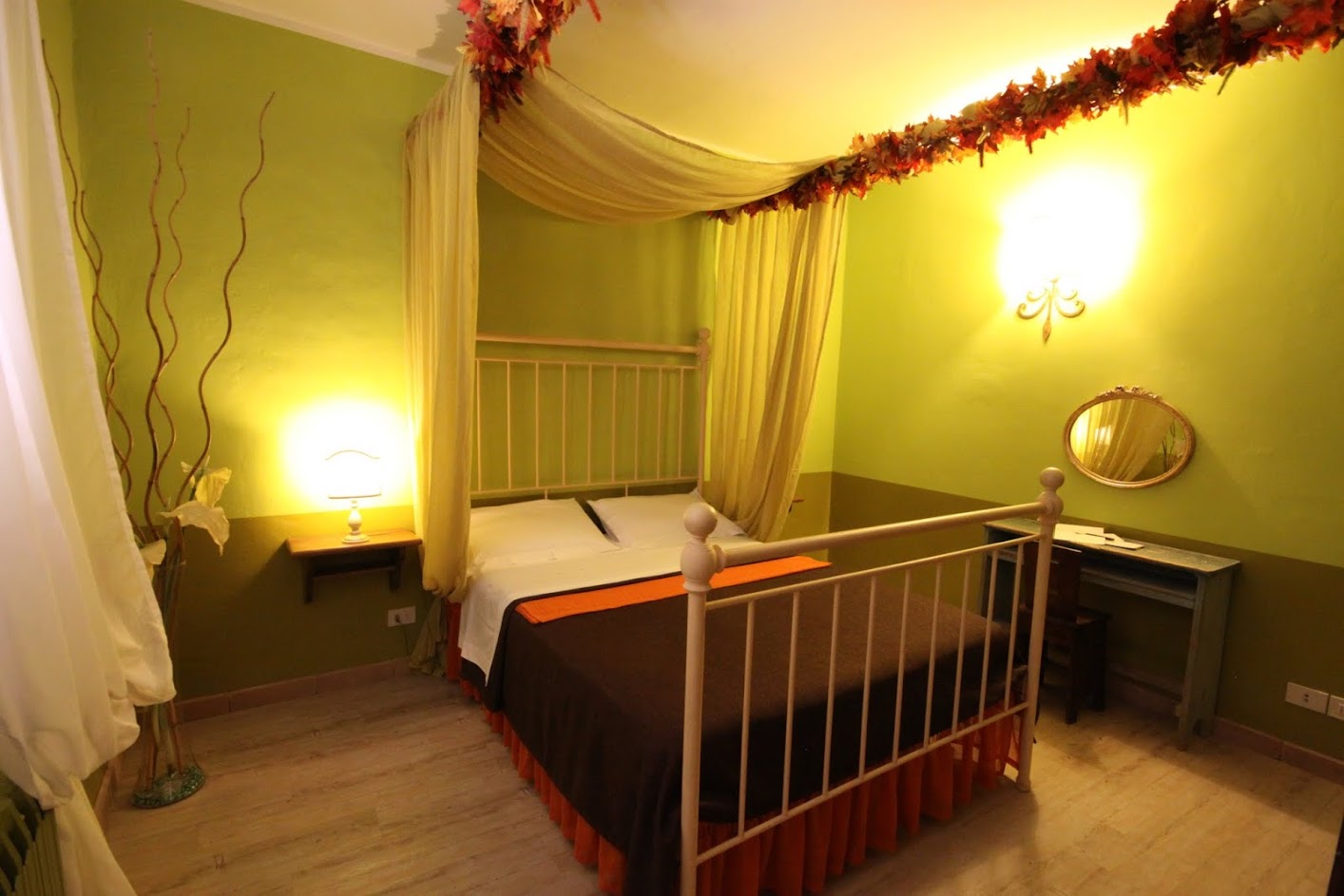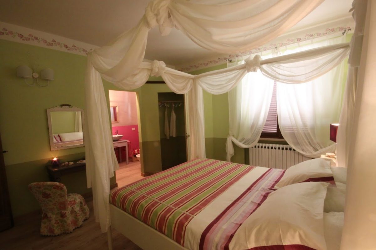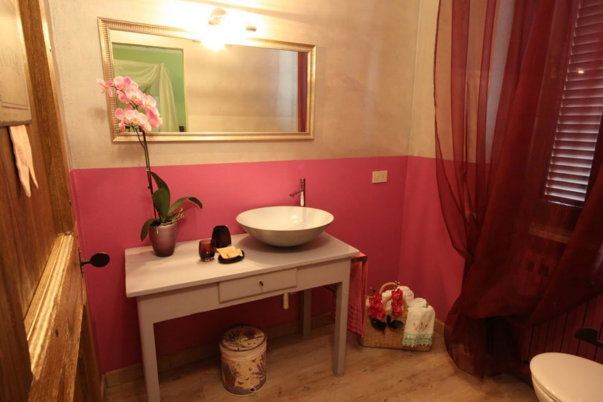 - Autumn room: this room has the colors of the grape-harvest and of the falling leaves. The leaves even decorate the canopy above the bed (190 x 150 cm). The walls are green like the Autumnal grass and there is a small old green school desk used as a writing table.Moreover there is a cupboard, a large ceiling fun and mosquito screen at the window. The bathroom is ensuite and spacious. It has two washbasins and a hydromassage shower. There is also an old night-stand in marble which has been in the owners’ family for generations. Sleeps 2.