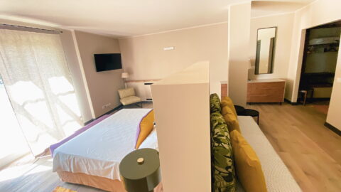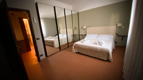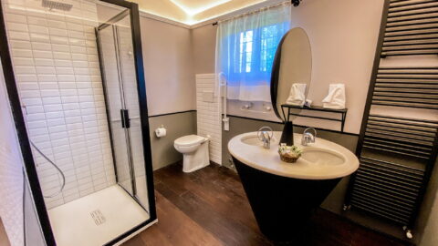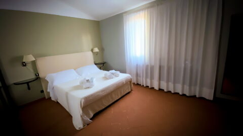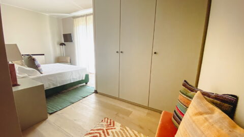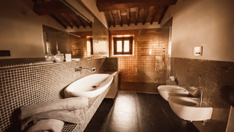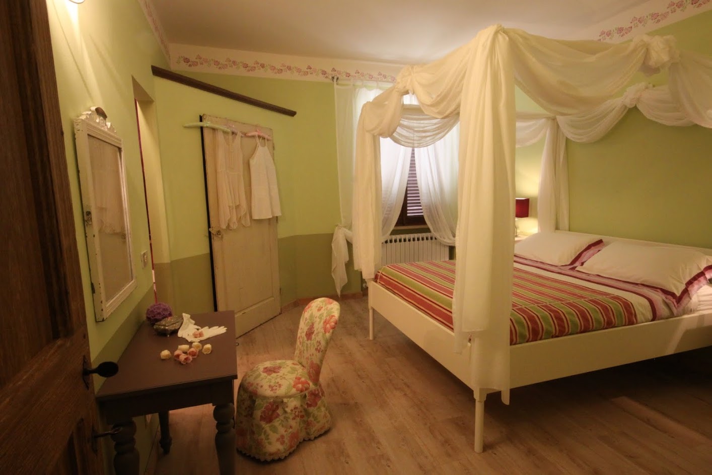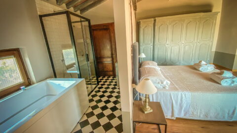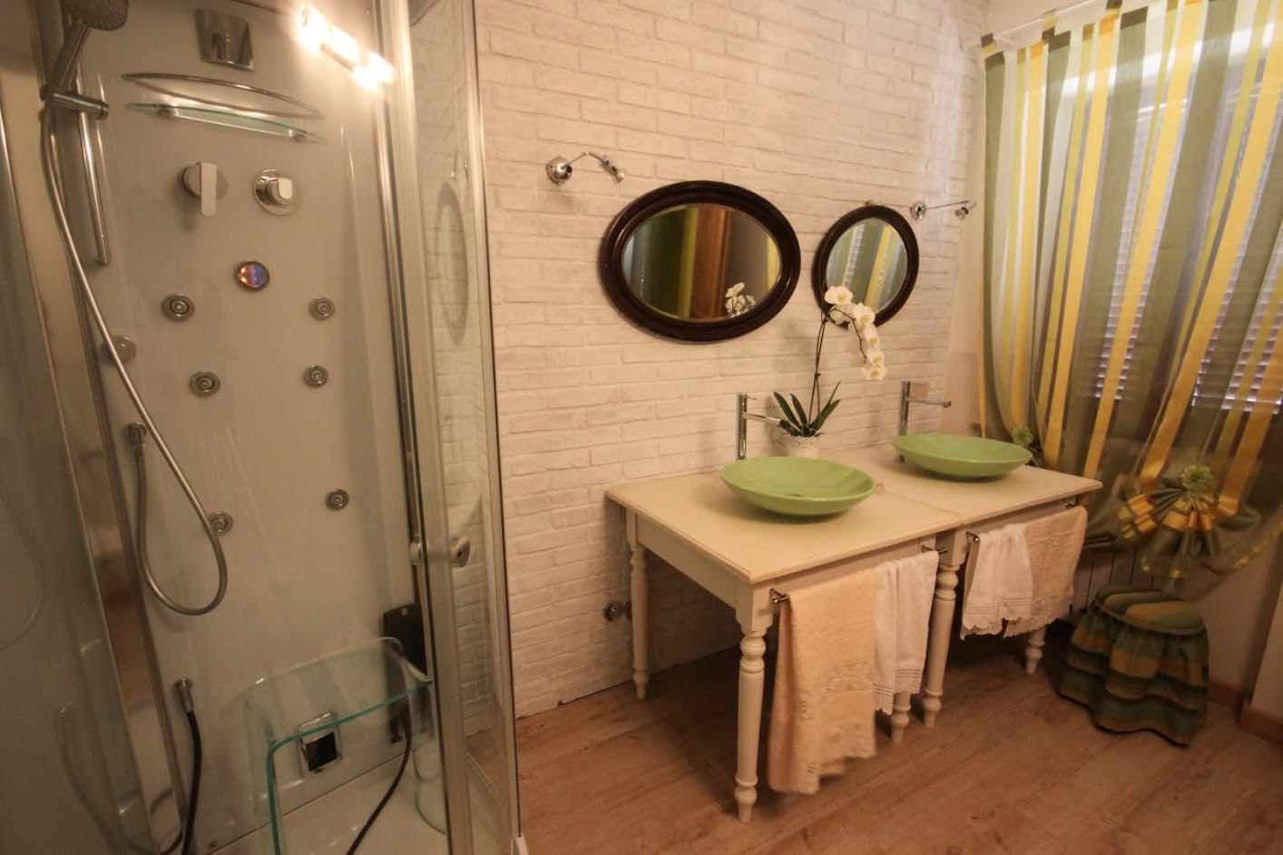 - Autumn room: this room has the colors of the grape-harvest and of the falling leaves. The leaves even decorate the canopy above the bed (190 x 150 cm). The walls are green like the Autumnal grass and there is a small old green school desk used as a writing table.Moreover there is a cupboard, a large ceiling fun and mosquito screen at the window. The bathroom is ensuite and spacious. It has two washbasins and a hydromassage shower. There is also an old night-stand in marble which has been in the owners’ family for generations. Sleeps 2.