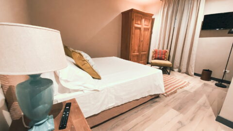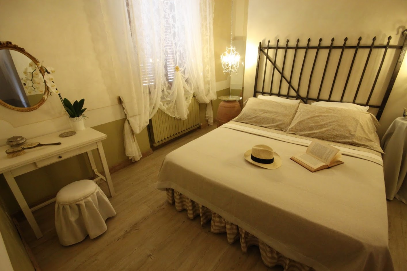 - Winter room: the winter brings snow and ice. The walls of this bedroom remind us of the opalescent white snow. However the atmosphere inside is not cold but cozy and welcoming. In this room there are some interesting pieces of furniture which have belonged to owners’ family for years. The head-board is a part of the old iron gate of the house and one of the bedside tables is an old terracotta vase which their forefathers used to store olive oil. Bed 190 x 160. is a spacious wardrobe, a little desk, a large ceiling fun and a mosquito screen at the window. There is an ensuite bathroom with shower. Sleeps 2.