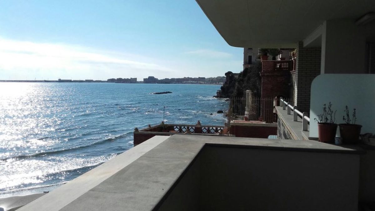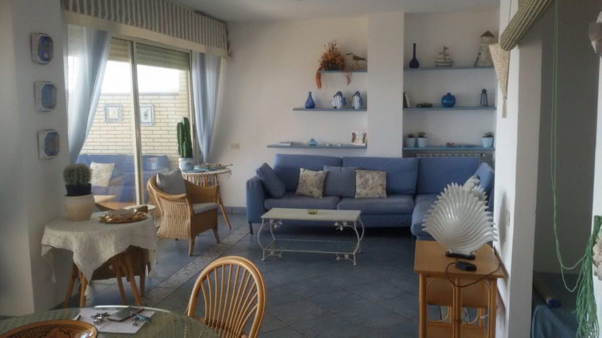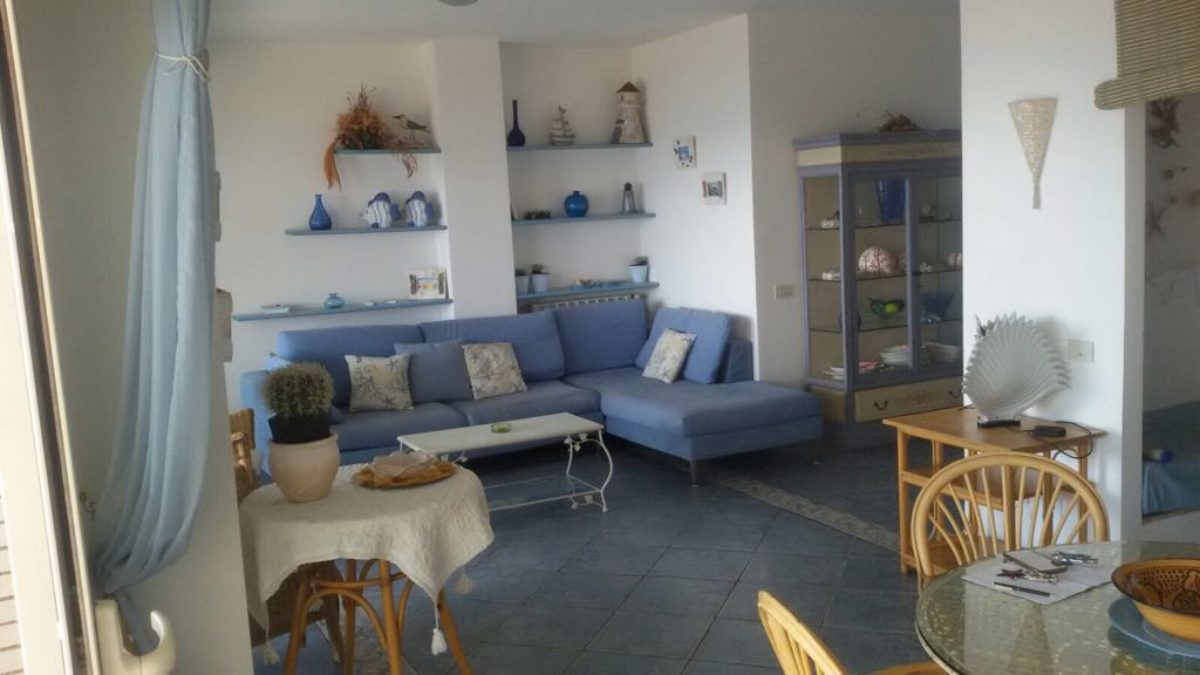 The large terrace (50 sq.mt.), comfortably equipped with dining table (6 seats) and a 4 small rattan armchairs, 1 armchair, 1 sofa – just in front to the beach – is perfect for a fresco dining on the warm Italian evenings!