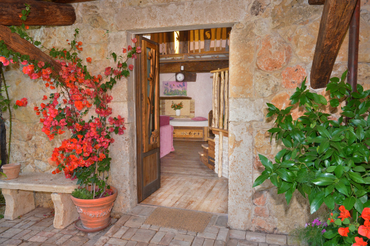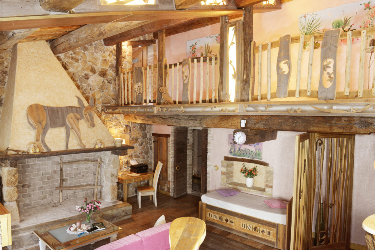 The interiors of the villa, adorned throughout with wood carvings, welcome guests with an impressive stone arch separating the living and dining area. The living room is furnished with colorful sofas and has a guest bathroom with a sink and toilet. It opens to the dining room, through which the villa’s pool and spa are accessed, which is framed by natural stone, wood-beamed ceilings, and painted panoramic views! There is an additional large lounge room with a sofa bed (160 cm) for two and a separate bathroom as well as another entrance to the pool and spa. The villa’s kitchen is well equipped with an oven, microwave, toaster, electric tea kettle, American coffee maker, Italian moka and espresso machine.