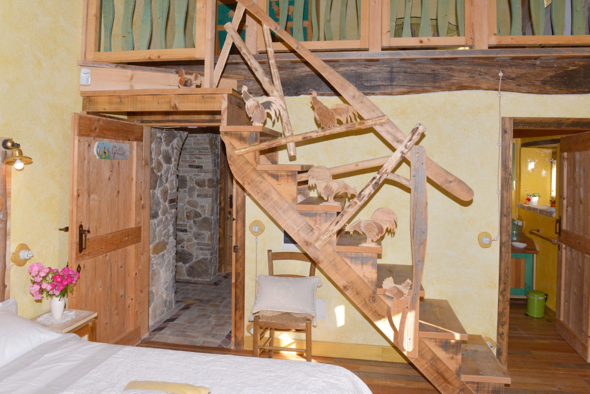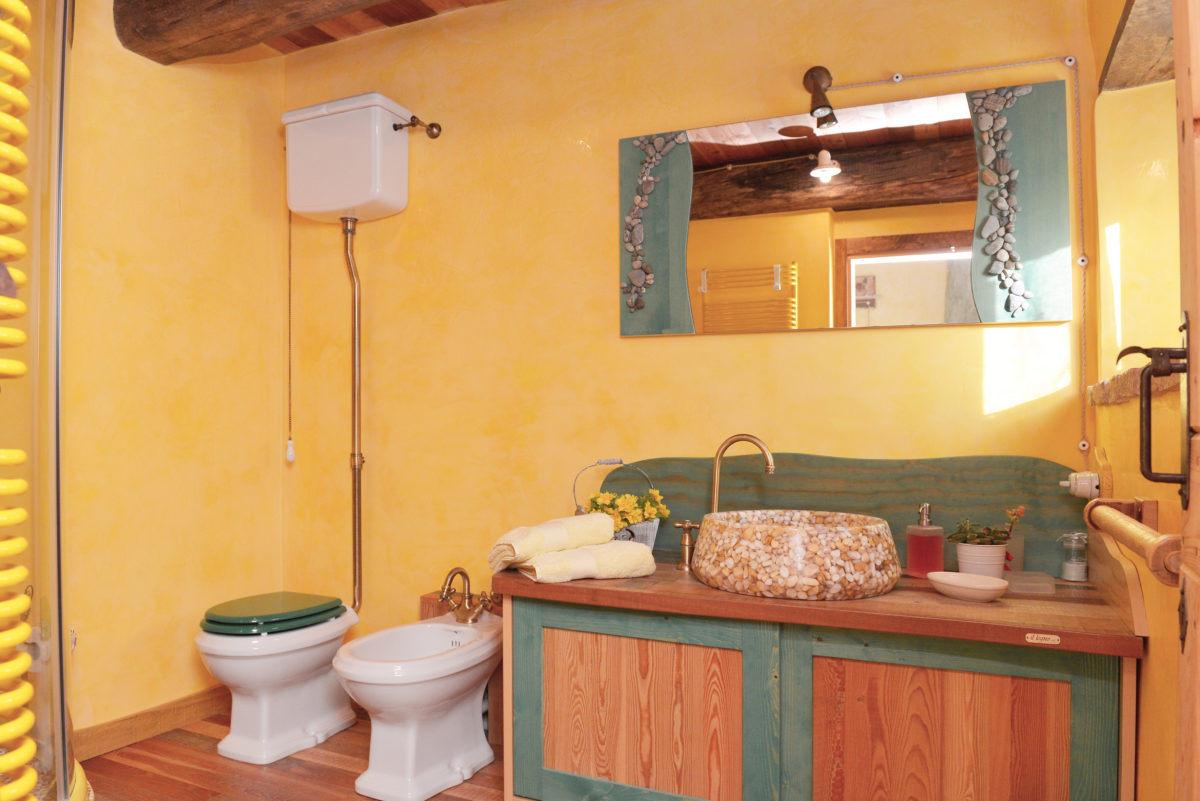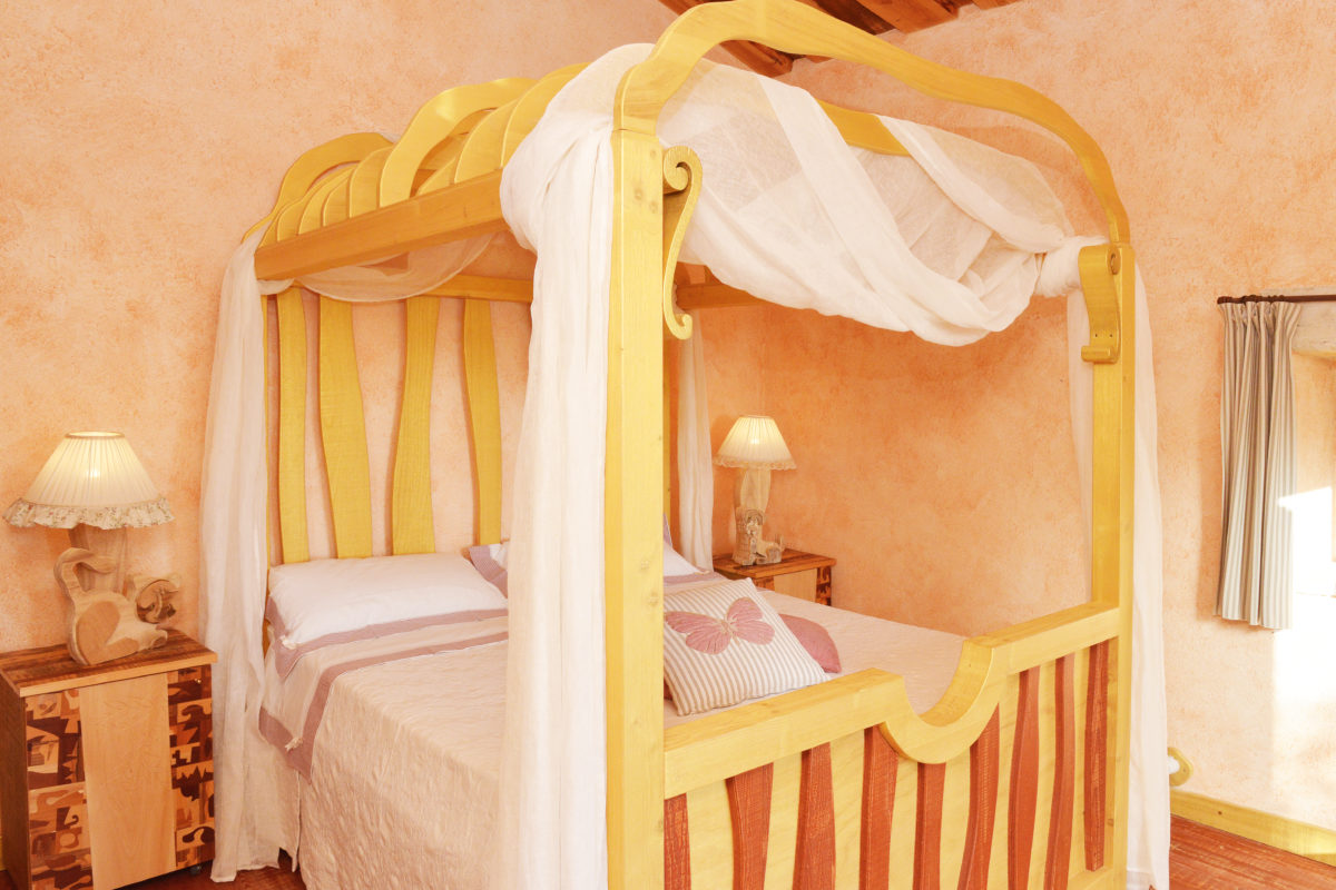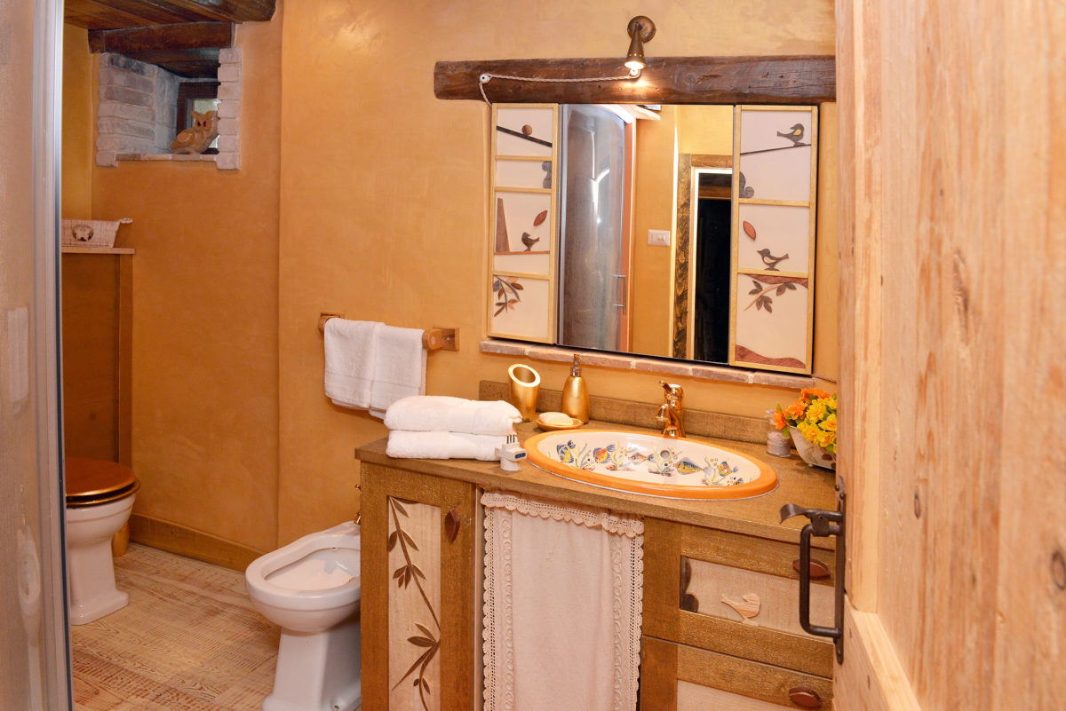 Four bedrooms, each with en suite bathrooms with showers, are on the ground floor. The first, Asinello, has a large queen size bed (170 cm) and one narrow bed (80 cm, most suitable for young people) in the loft. The second, Gallo, has a queen size bed (160 cm) and a decorative loft. The third bedroom, Capretta, is the children’s blue and yellow room. It has two narrow single beds (80 cm; most suitable for young people); one on the main floor of the bedroom and the second in the bedroom’s loft. The fourth bedroom, Gatto, has a queen size bed (160 cm) and a decorative loft. All of the bedrooms have access to the villa’s garden.