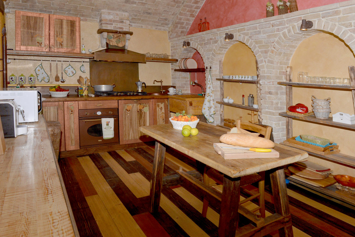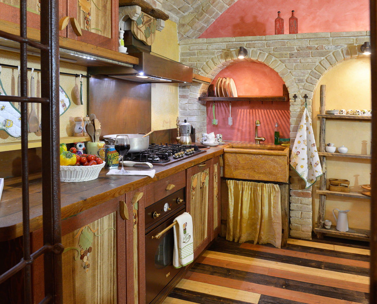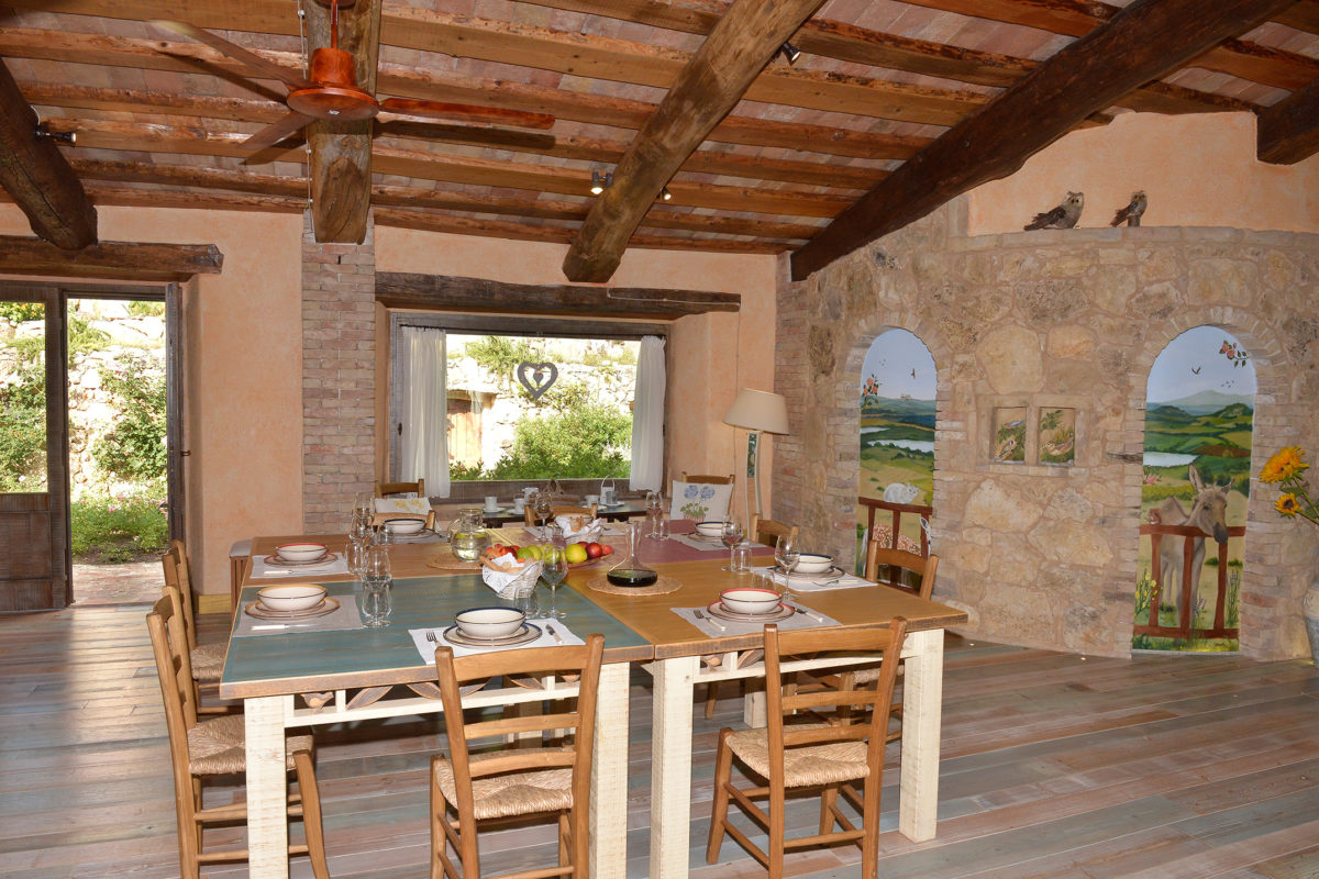 Four bedrooms, each with en suite bathrooms with showers, are on the ground floor. The first, Asinello, has a large queen size bed (170 cm) and one narrow bed (80 cm, most suitable for young people) in the loft. The second, Gallo, has a queen size bed (160 cm) and a decorative loft. The third bedroom, Capretta, is the children’s blue and yellow room. It has two narrow single beds (80 cm; most suitable for young people); one on the main floor of the bedroom and the second in the bedroom’s loft. The fourth bedroom, Gatto, has a queen size bed (160 cm) and a decorative loft. All of the bedrooms have access to the villa’s garden.