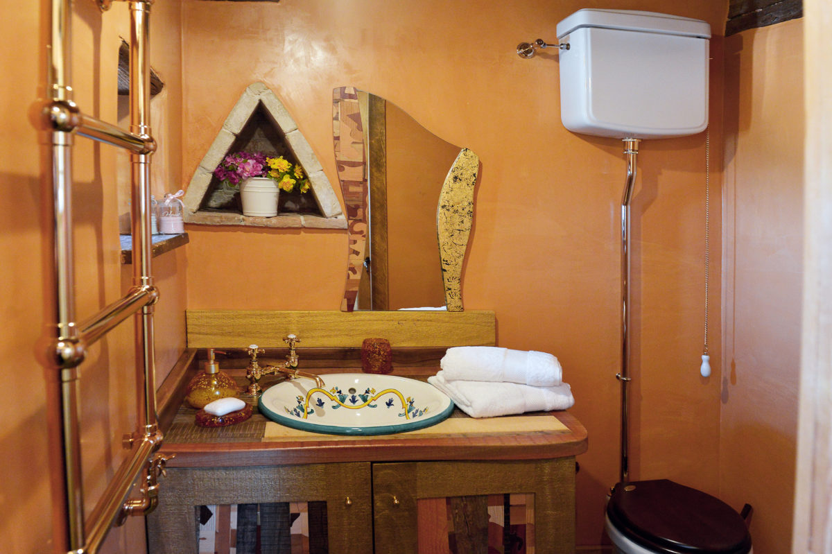 Stairs from the lounge lead up to one double bedroom with an en suite bathroom, the Gufo Suite, on the first floor. This suite has a large queen size bed (170 cm) and a narrow single bed (80 cm, most suitable for young people) and within the bathroom is a Jacuzzi tub with a shower head. It has a private boardwalk connecting it to the upper level of the garden.