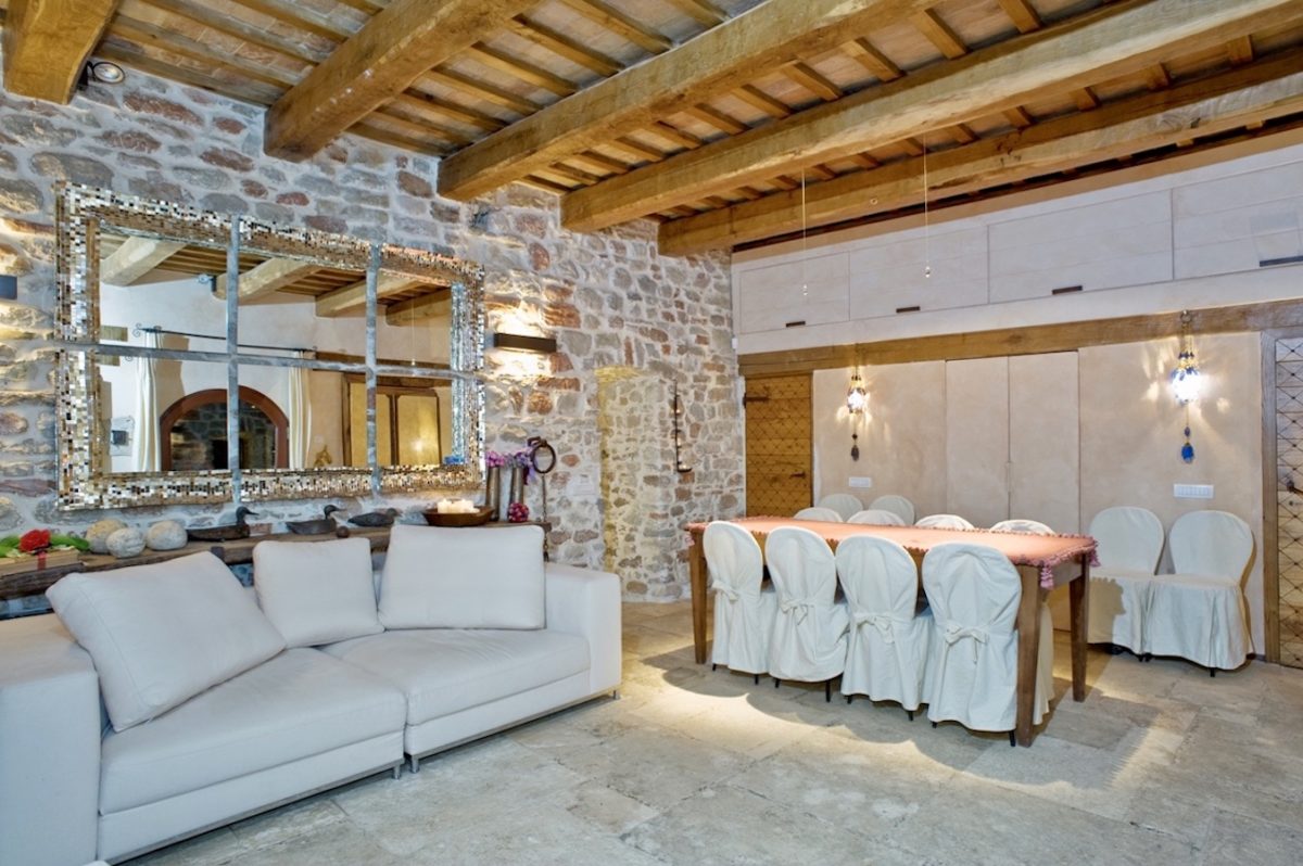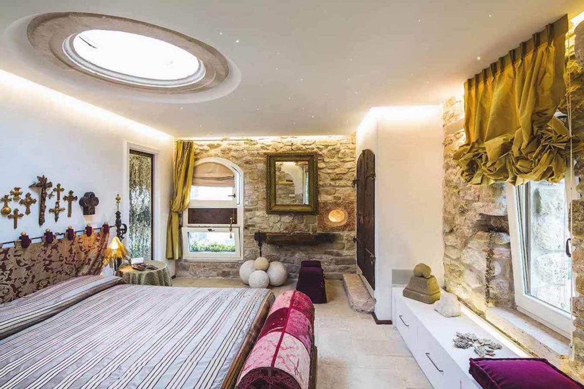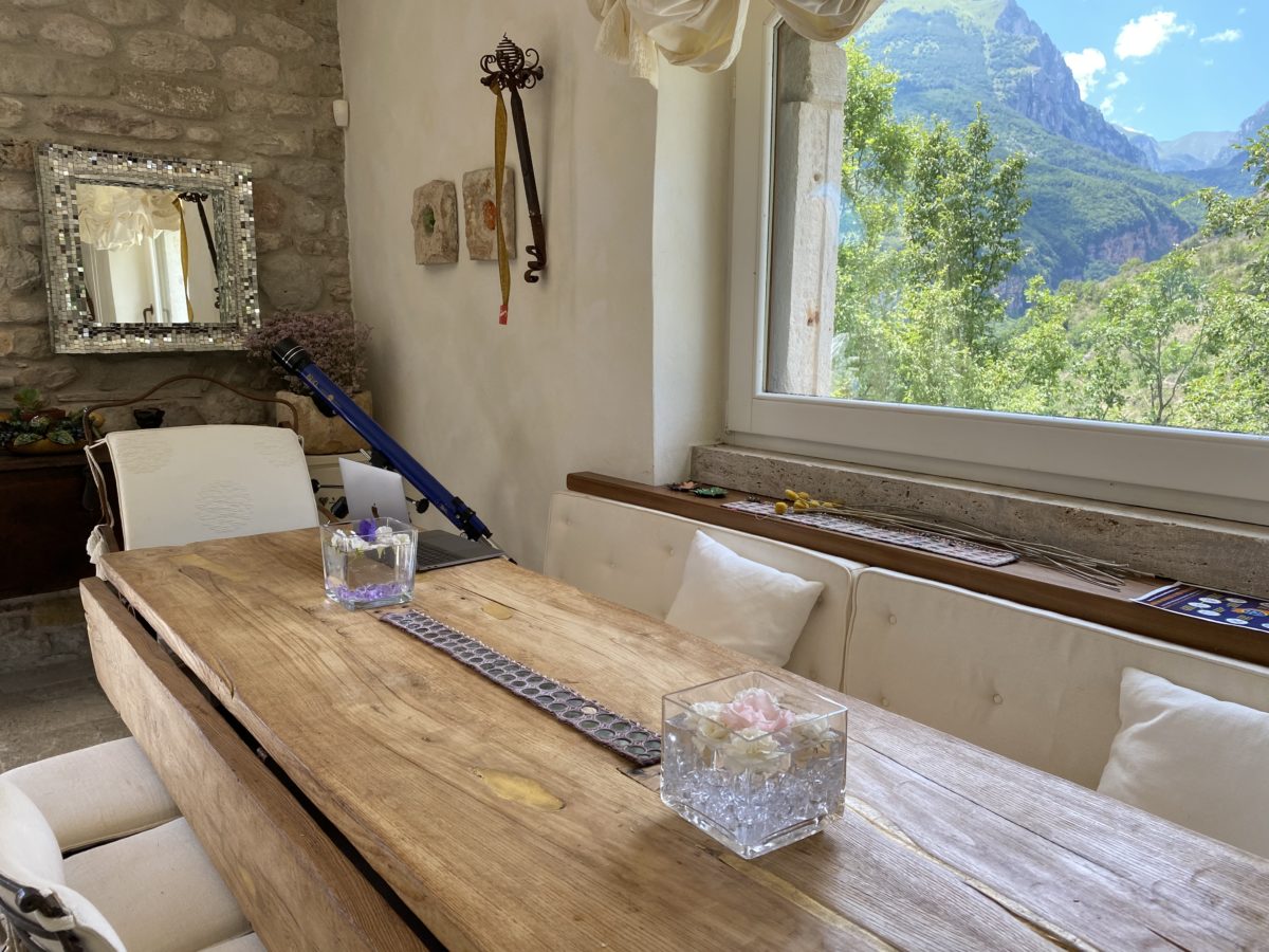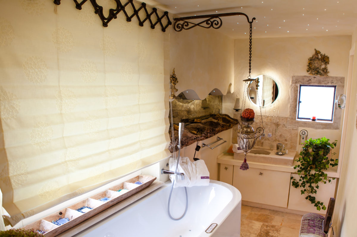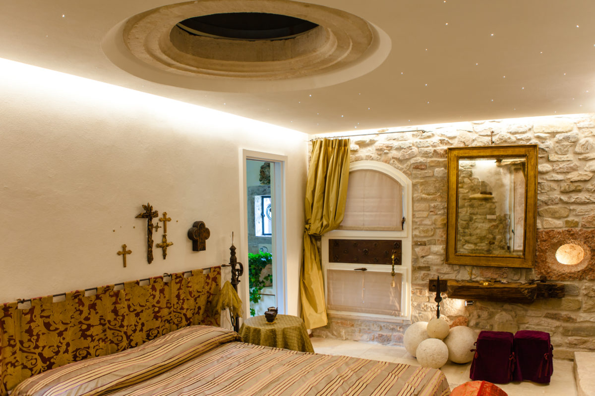 Personality, elegance and attention to detail are perceivable everywhere: in the lighting, the furniture and in the bathroom. Everywhere in this romantic apartment perfect for a couple, the restored original architecture combines with modern design, resulting in great comfort and refinement. The living room with rollaway kitchen area on the ground floor leads to a lush courtyard, like a balcony into the mountain. The double bedroom and bathroom with double access are prime examples of a skilled and creative restoration with refined materials.
