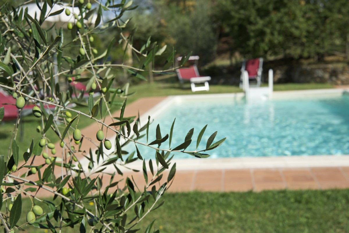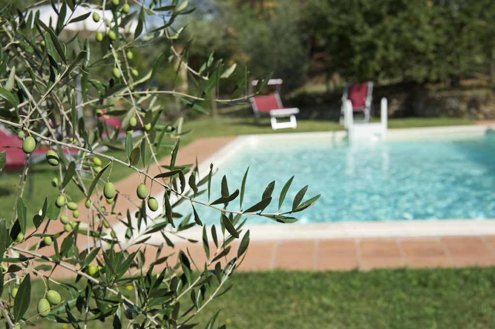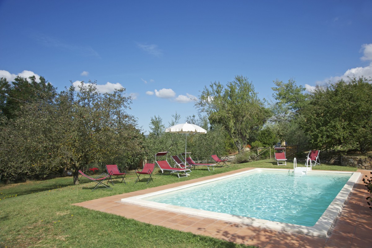 In the sunny garden, a short distance away from the villa, is a completely fenced swimming pool with pergola. It is the ideal place to relax and enjoy the Tuscan sun.
