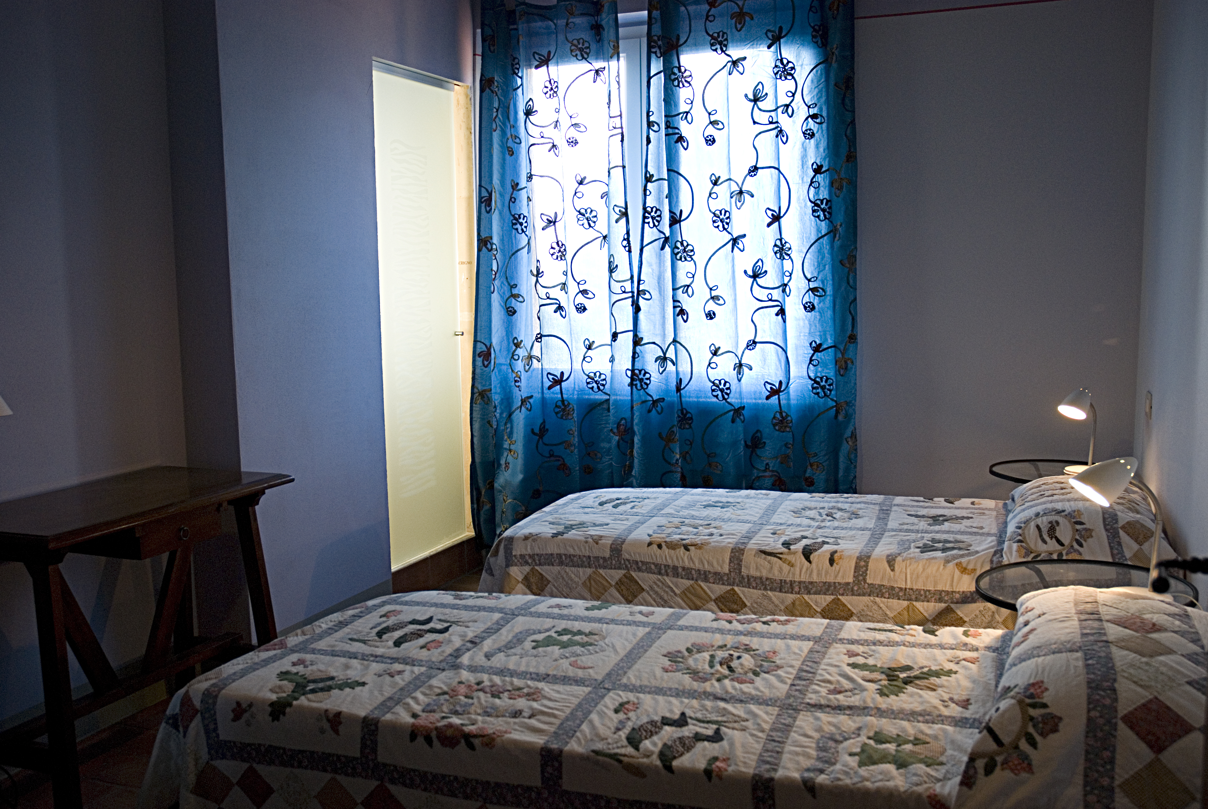 To the back of the lounge is a small hall off which there is a guest toilet and two bedrooms. On the right is a twin bedroom with two iron beds with matching bedside tables. A double door, wooden wardrobe completes the furnishings. Bathroom with shower.