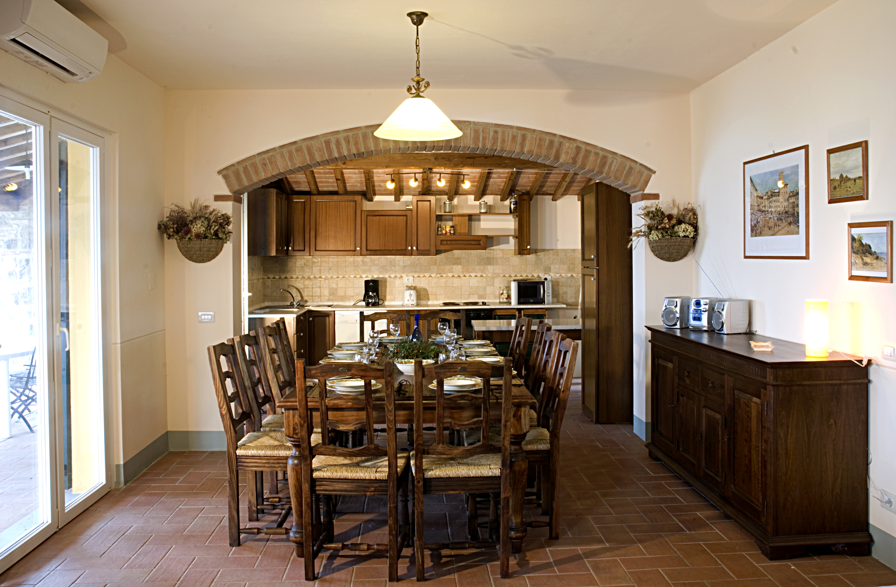 In the centre of the room is a pretty terracotta arch, under which there is a huge wooden dining table that seats up to 12 people. To one side is a wooden sideboard. The entire room is paved in the traditional Tuscan villa style of terracotta floor tiles.