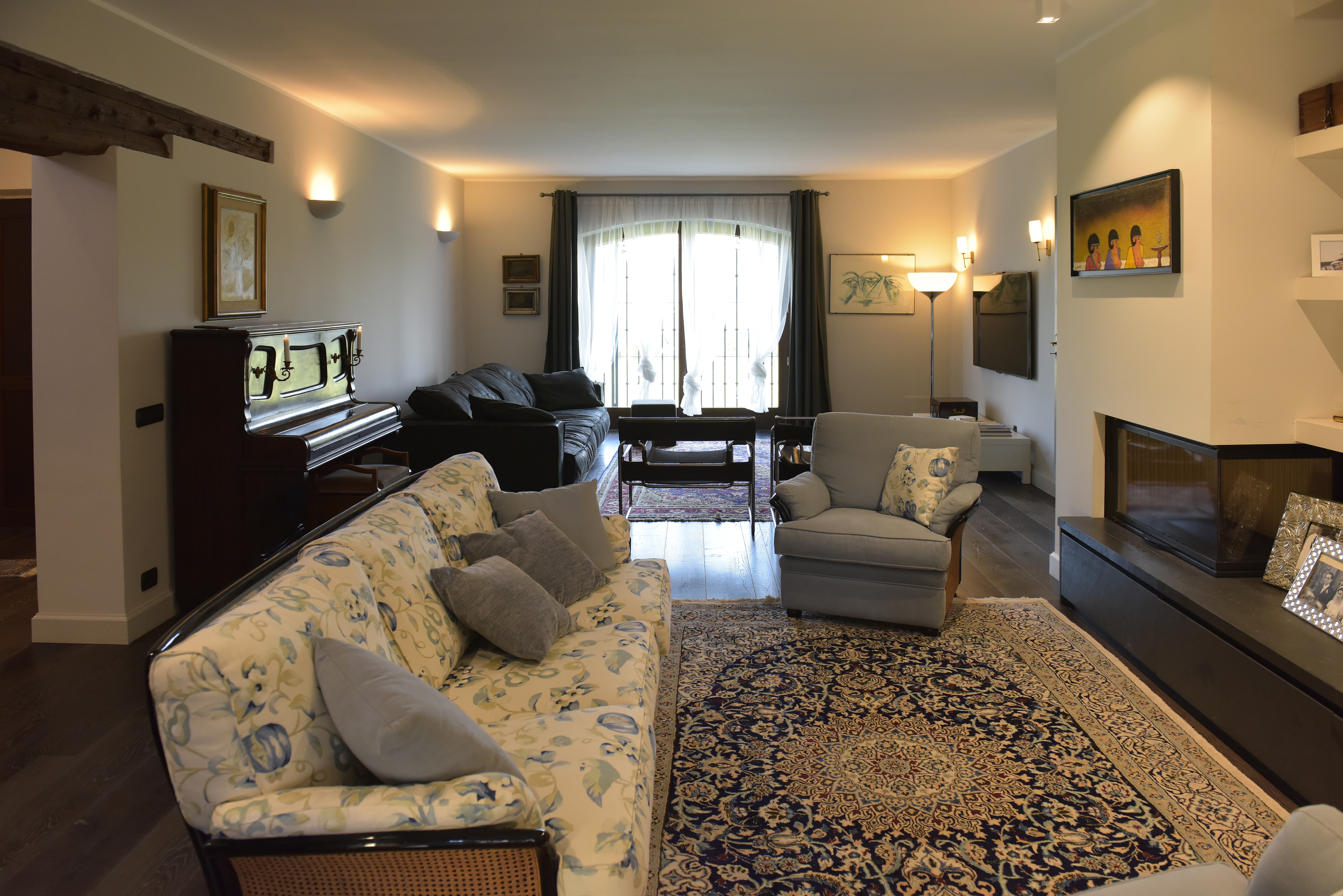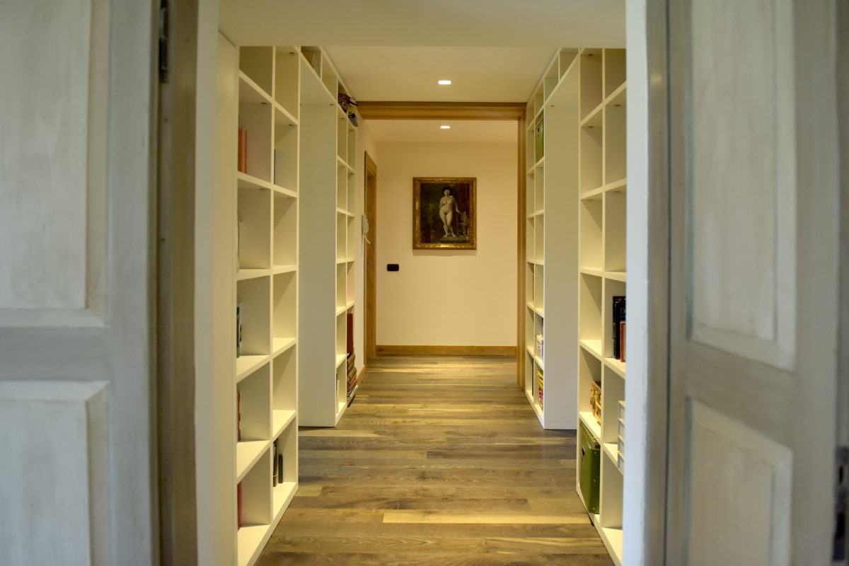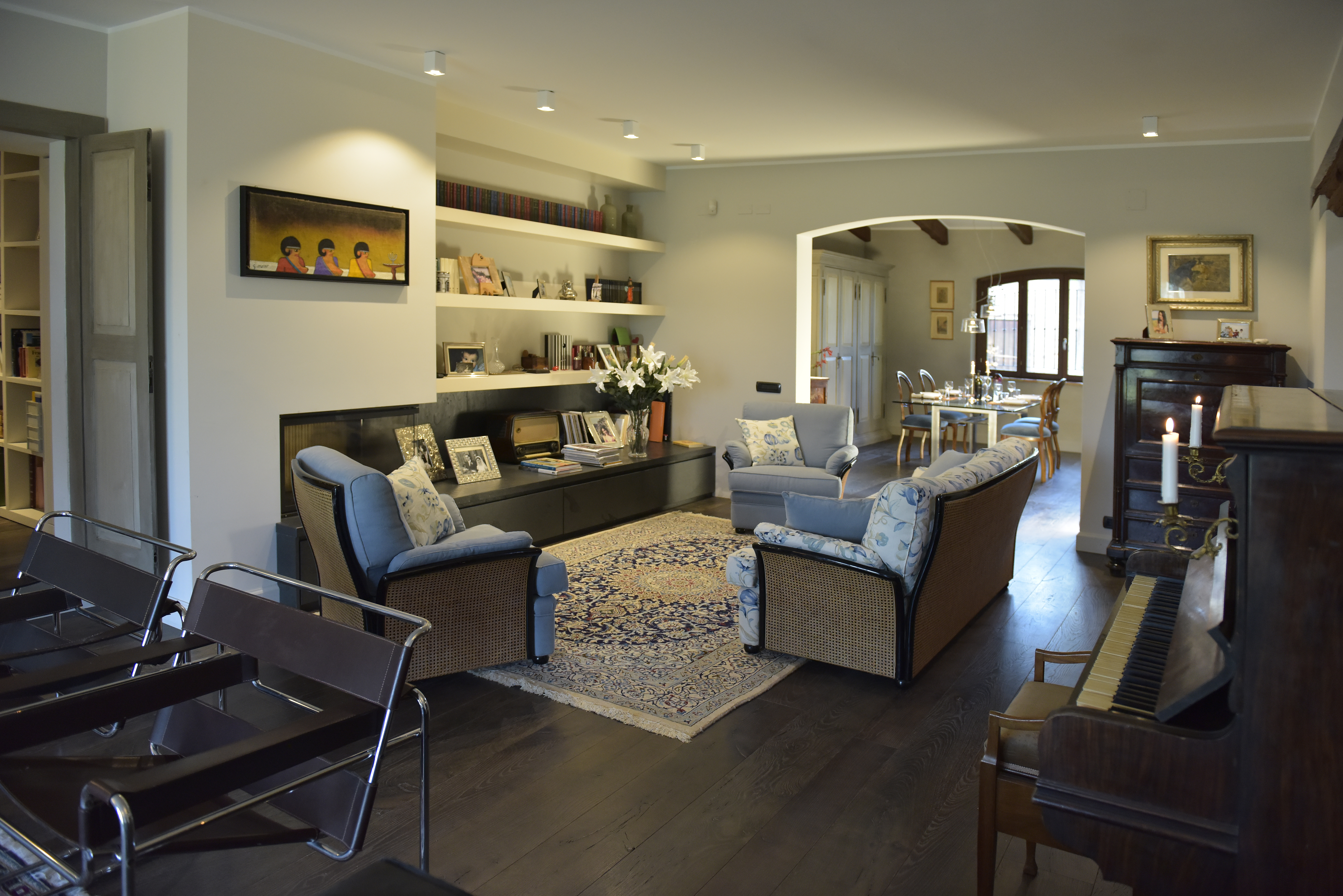 A huge hallway takes to an open space area which hosts a large hidden kitchen with fireplace, dishwasher, oven and little wine cellar, a large and lightly living room with air conditioning well separated into dining and reading area with a 65″ TV, also to a service bathroom.