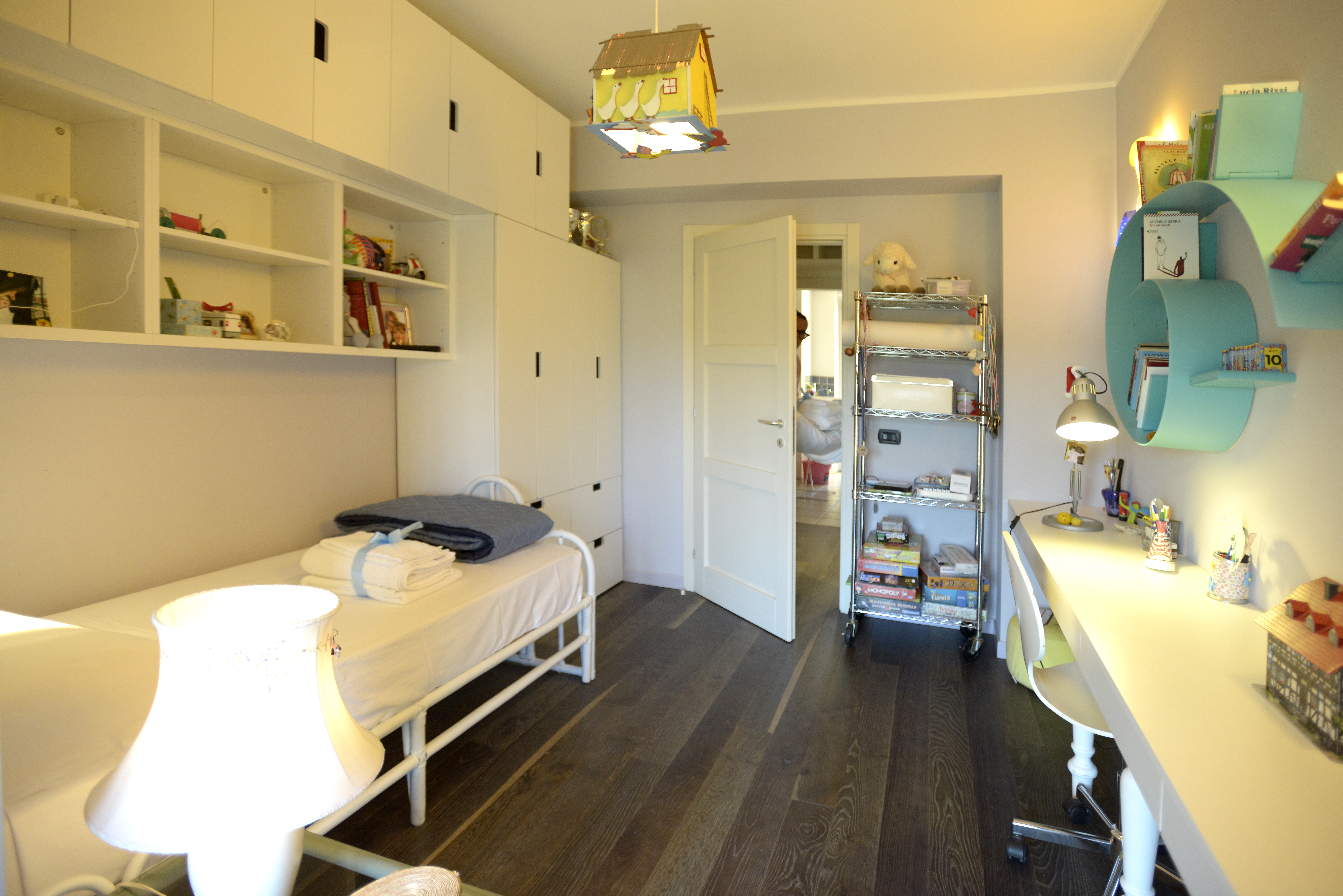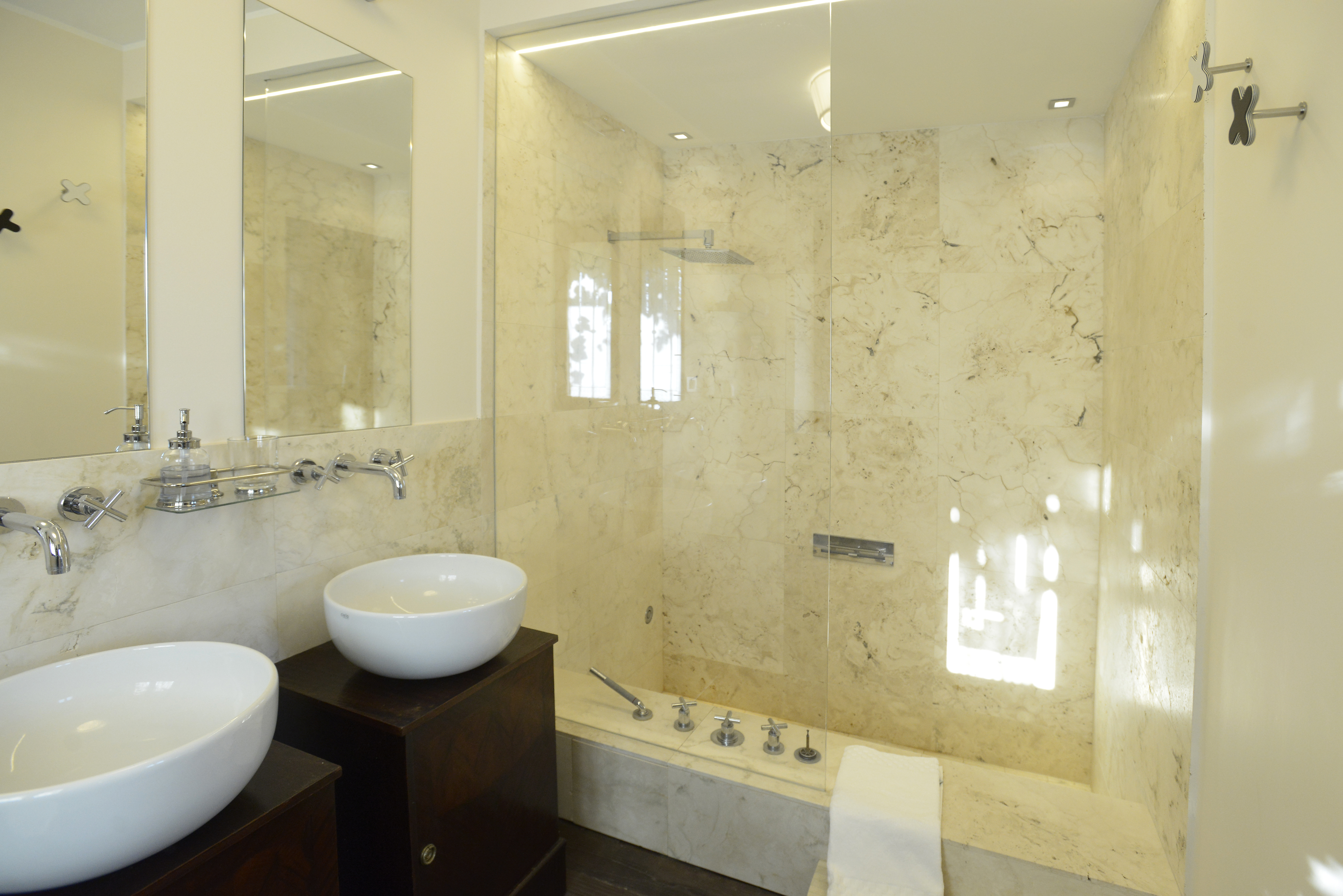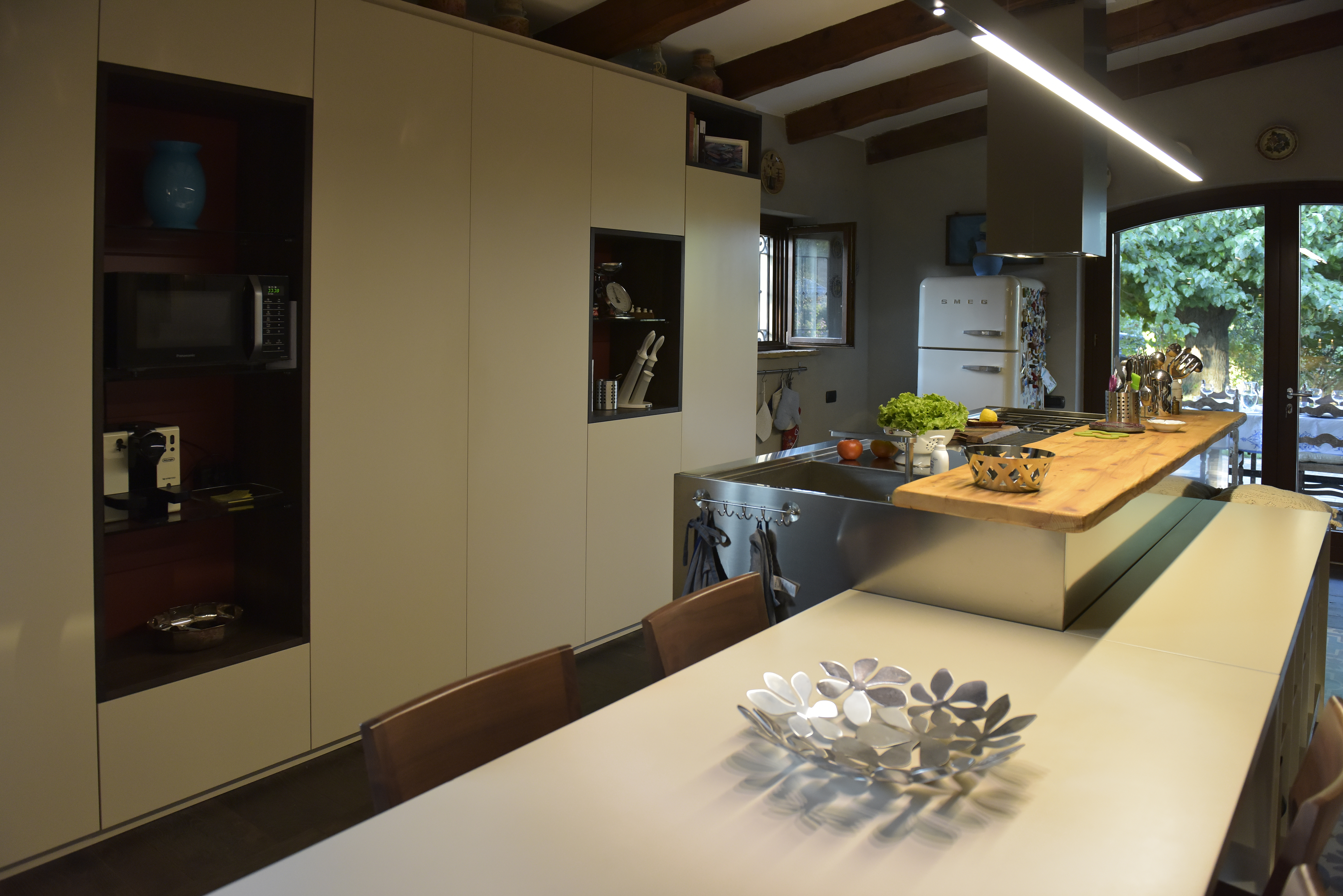 A huge hallway takes to an open space area which hosts a large hidden kitchen with fireplace, dishwasher, oven and little wine cellar, a large and lightly living room with air conditioning well separated into dining and reading area with a 65″ TV, also to a service bathroom.