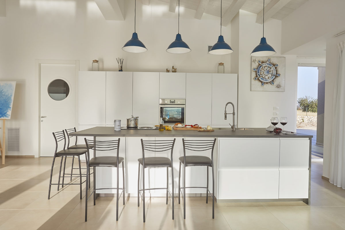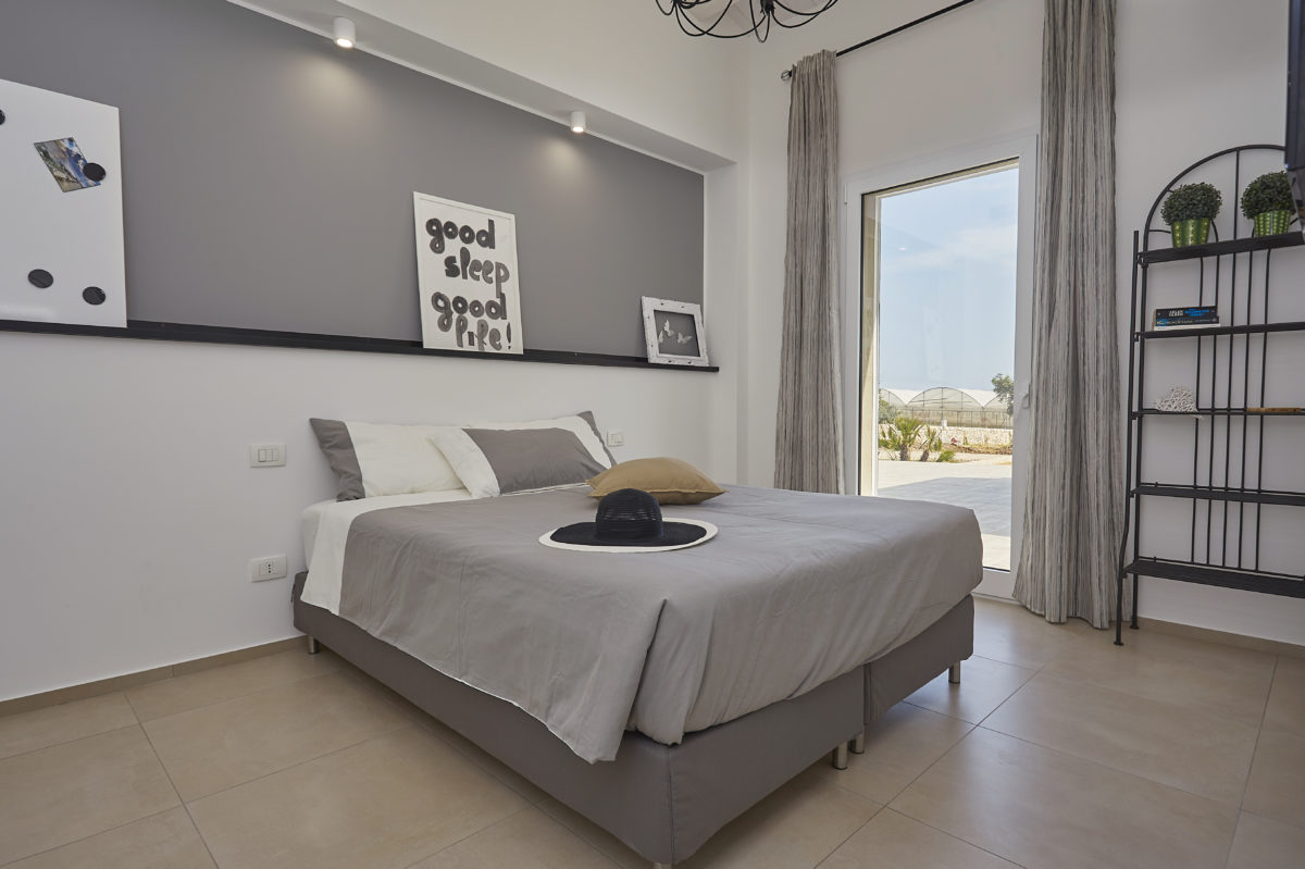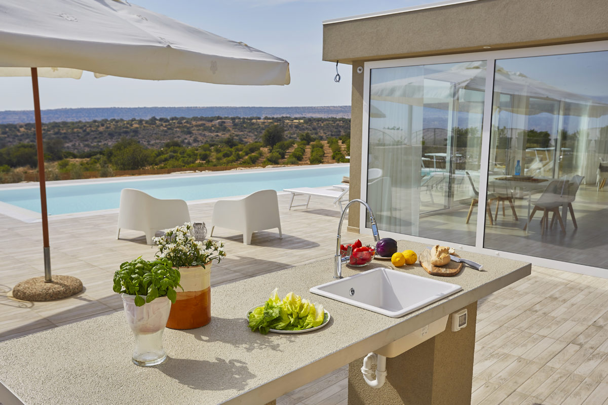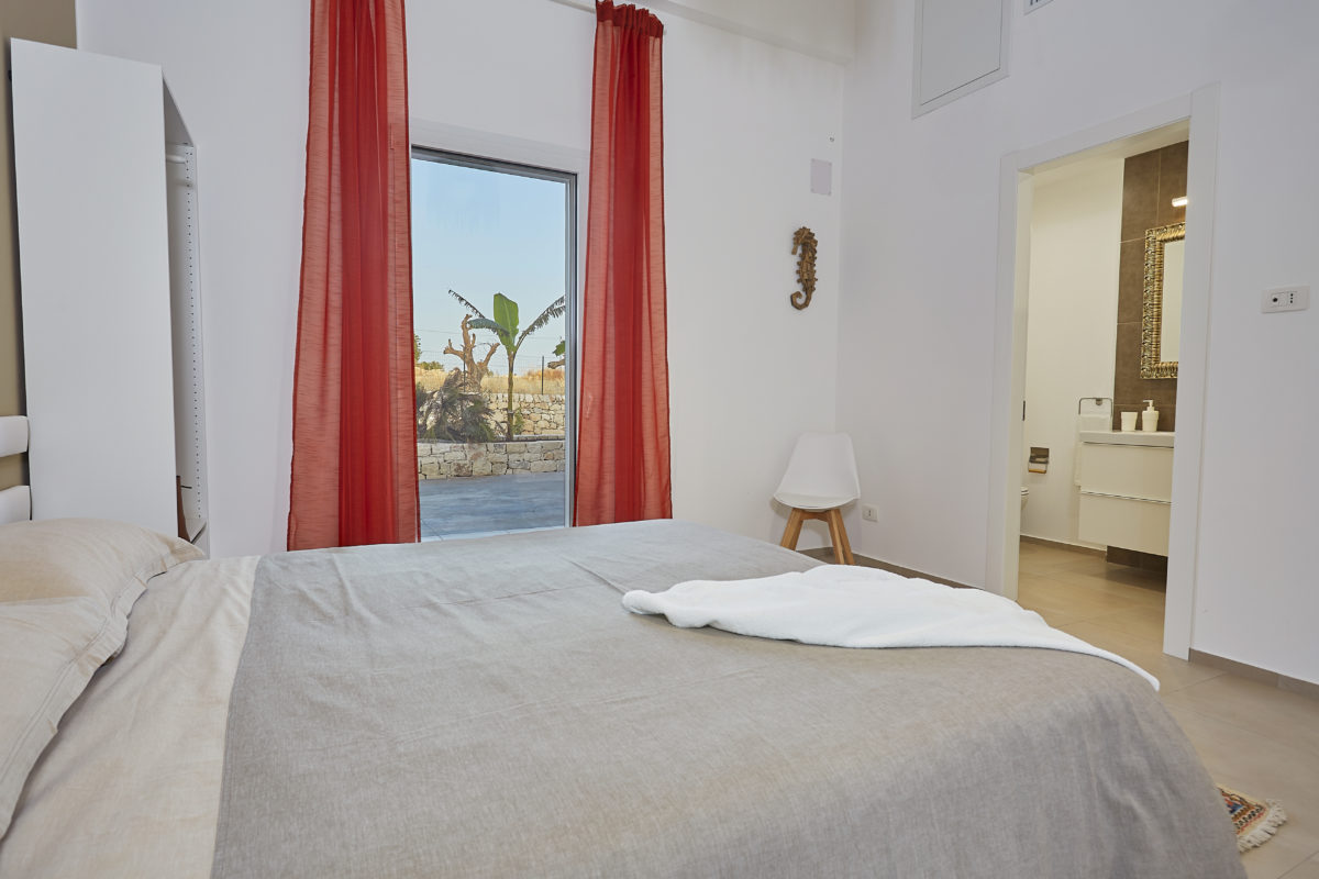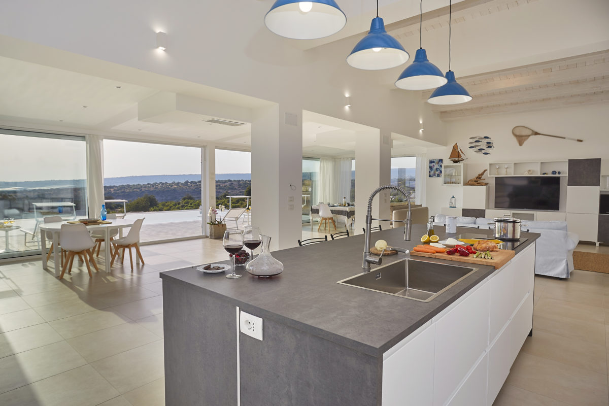 Inside, there’s a spacious modern kitchen and a bright living area, decorated in a soft shade of white, the perfect place to relax, maybe sipping a good Sicilian wine and admiring the outdoor view.
