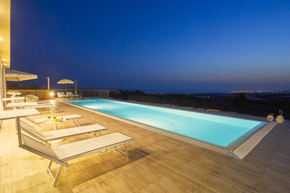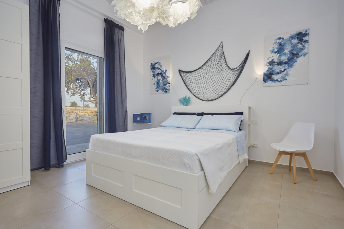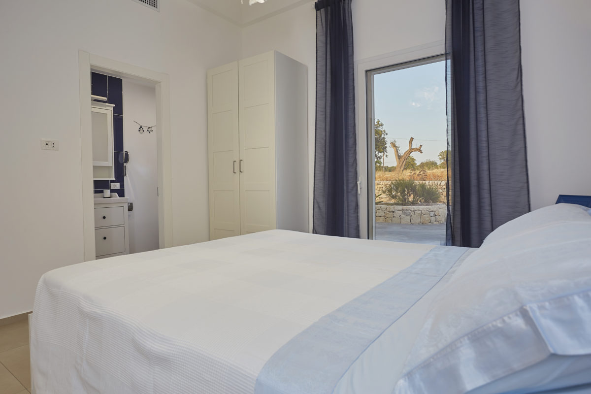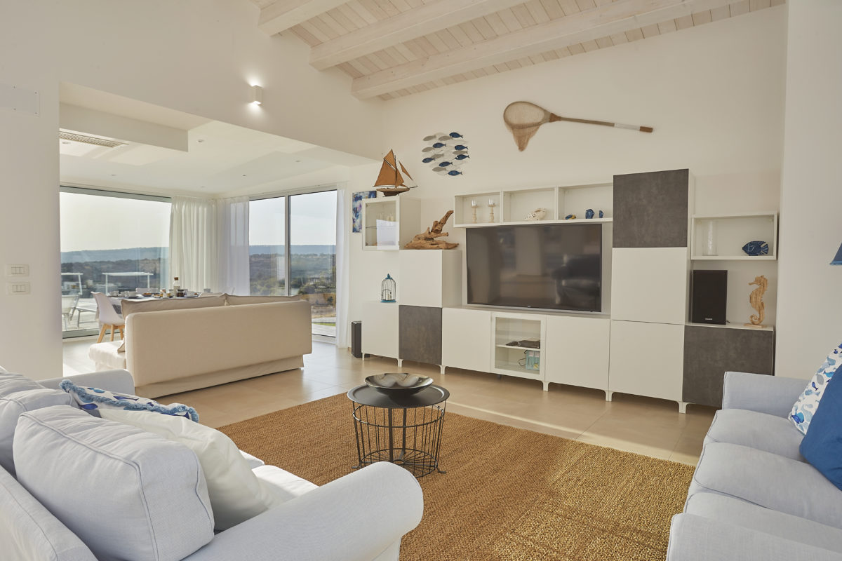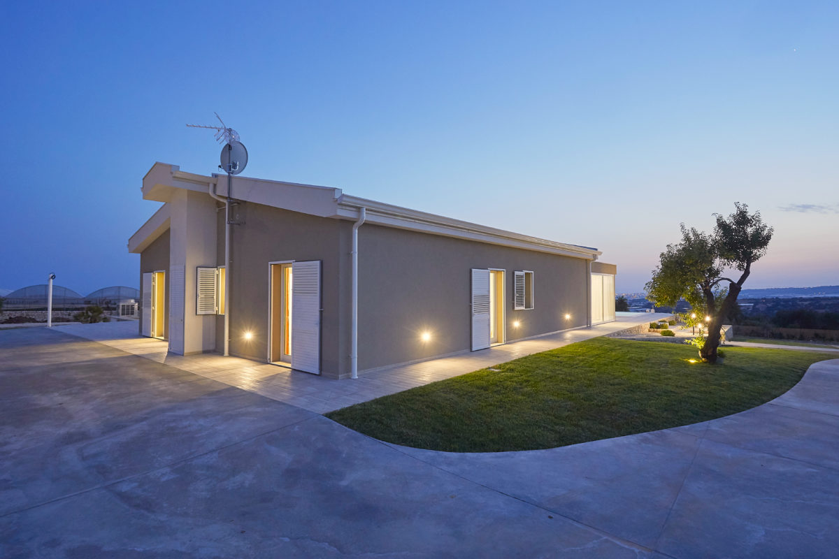 Inside, there’s a spacious modern kitchen and a bright living area, decorated in a soft shade of white, the perfect place to relax, maybe sipping a good Sicilian wine and admiring the outdoor view.