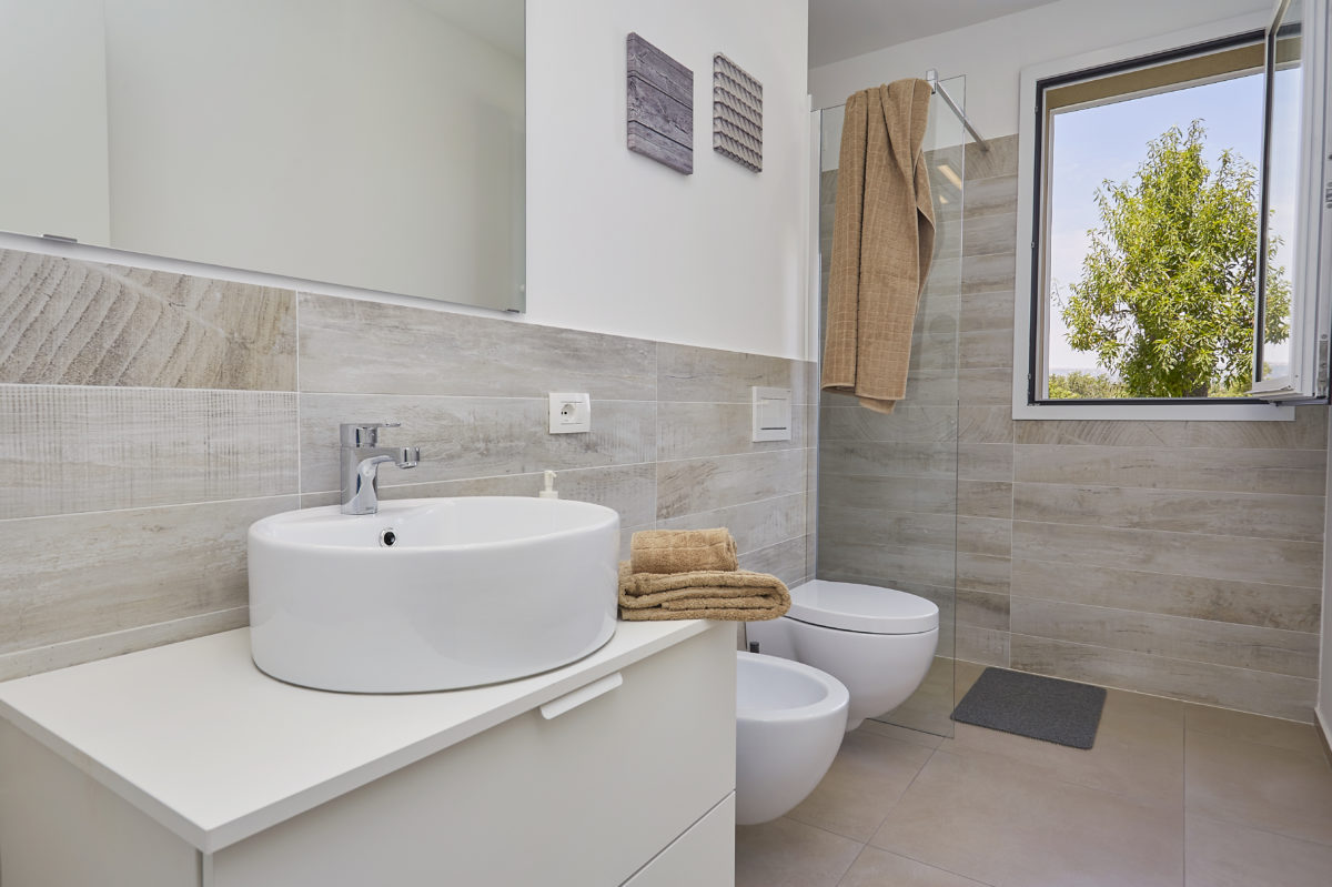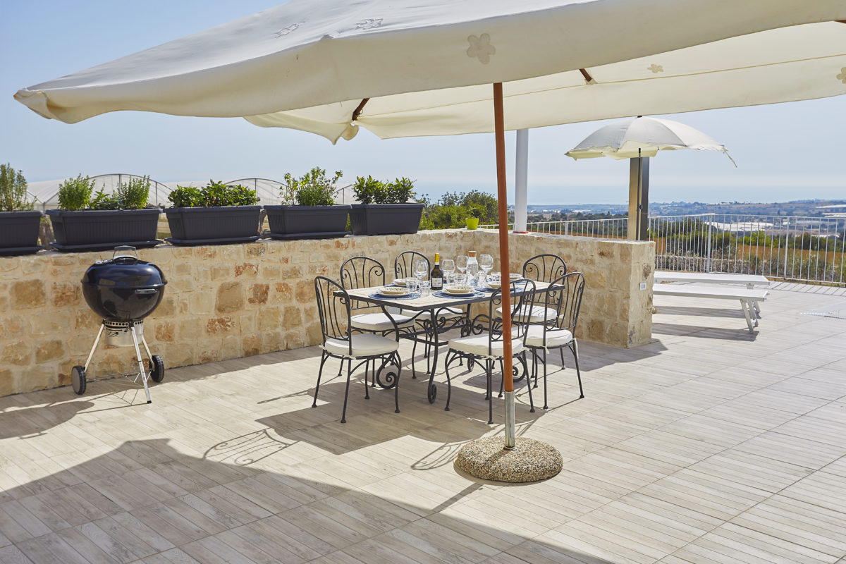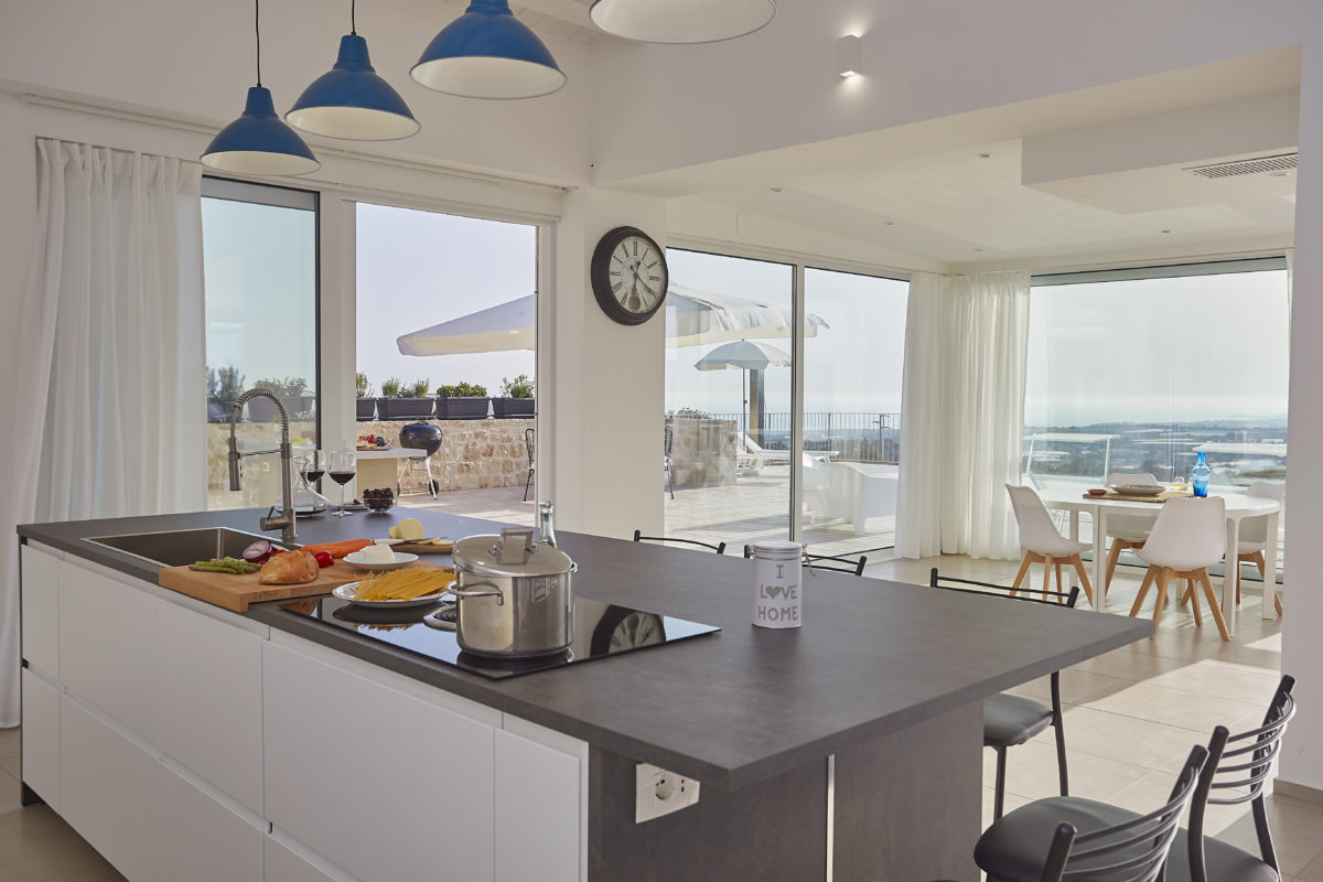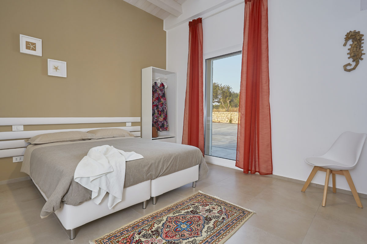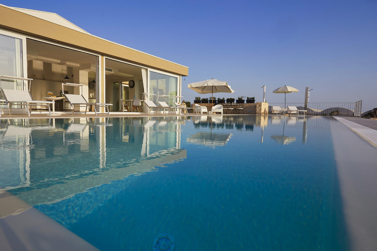 Inside, there’s a spacious modern kitchen and a bright living area, decorated in a soft shade of white, the perfect place to relax, maybe sipping a good Sicilian wine and admiring the outdoor view.