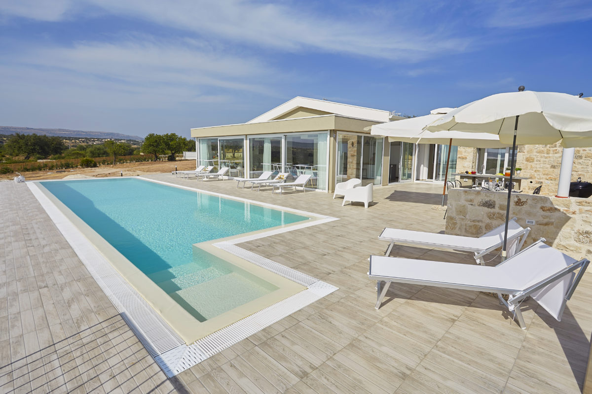Once through the traditional stone-wall entrance, you’ll be dazzled by the amazing infinity pool with a panoramic view of Marina di Ragusa. You can’t miss the fabulous view from inside the villa, either, thanks to the large windows which are such a prominent feature.