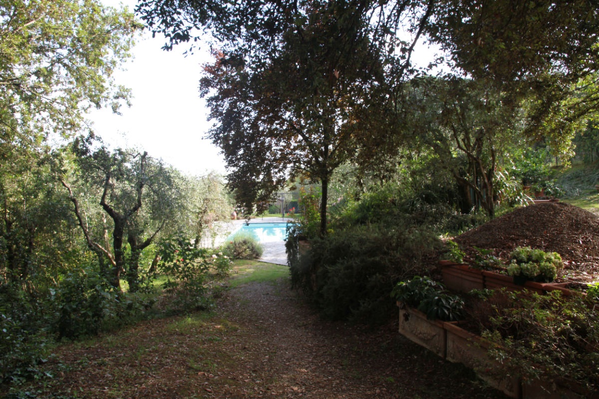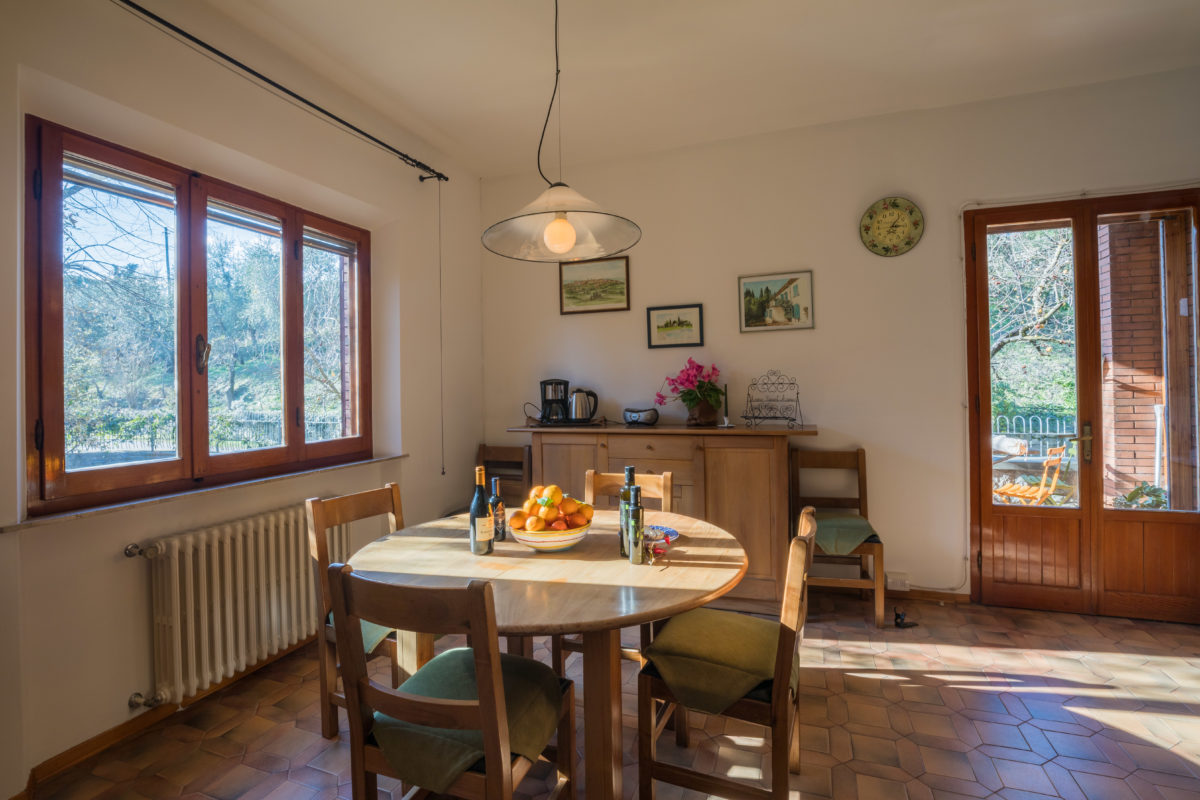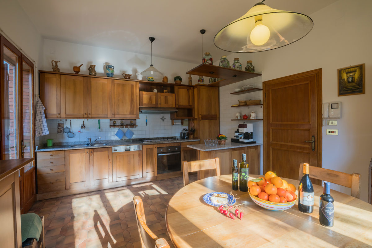 Villa Lucignano opens onto the garden that leads to the swimming pool, equipped with shower, a solarium with deck chairs and sun beds. In the garden there’s also a gazebo with table, chairs and armchairs. The house is developed in one floor. The kitchen, fully equipped with a dishwasher and a microwave oven, opens onto a terrace equipped for dining.