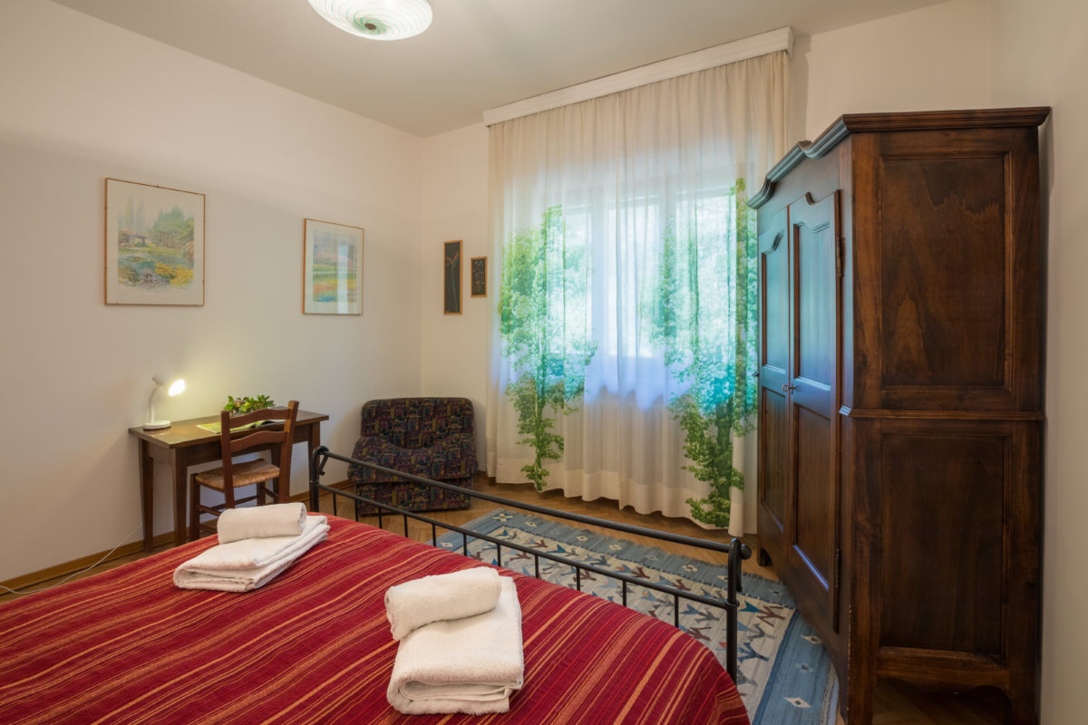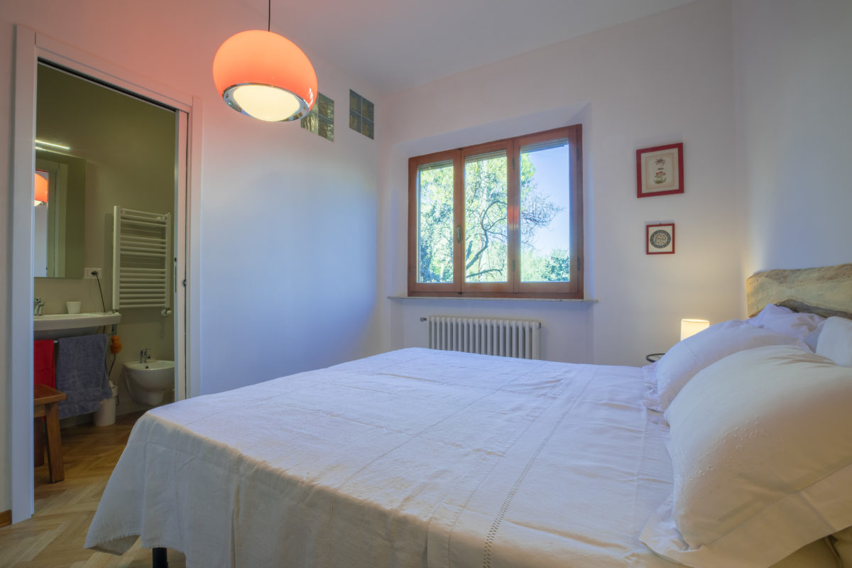 The spacious living room is furnished with armchairs and TV. The sleeping area is characterized by a corridor overlooking the rooms, one with a private bathroom, and a shared bathroom. Outdoor there’s a barbecue and a traditional wood oven. The surrounding landscape is typically Tuscan.