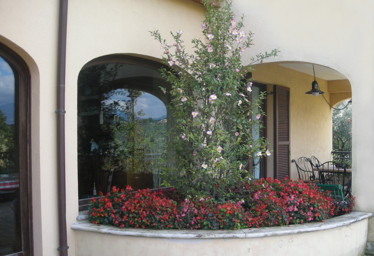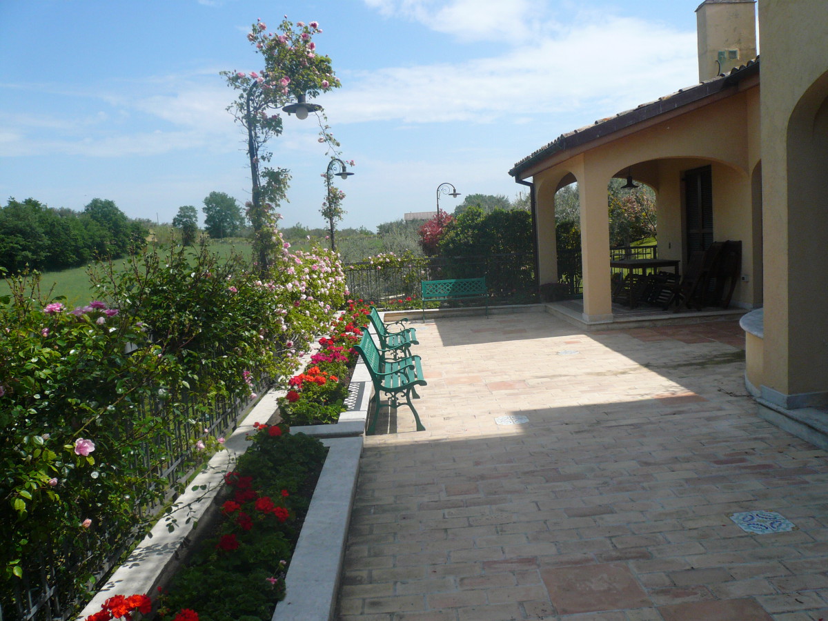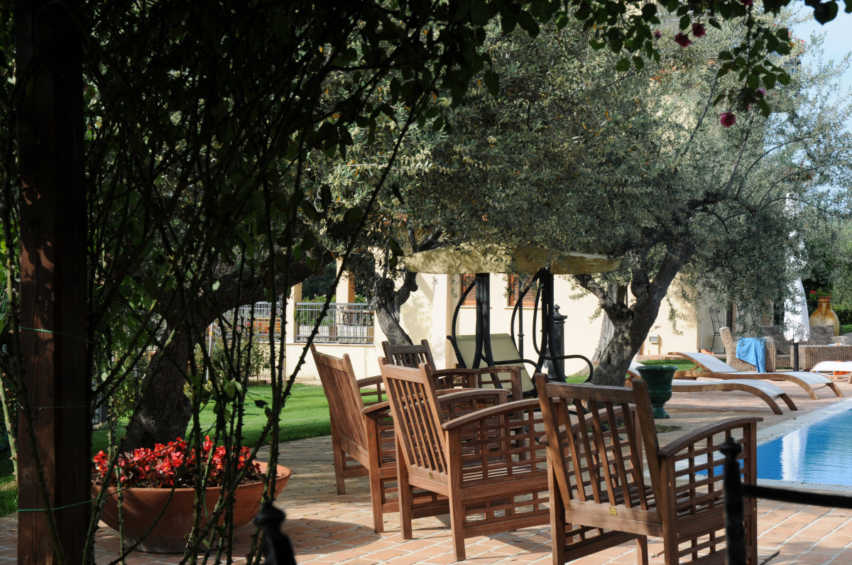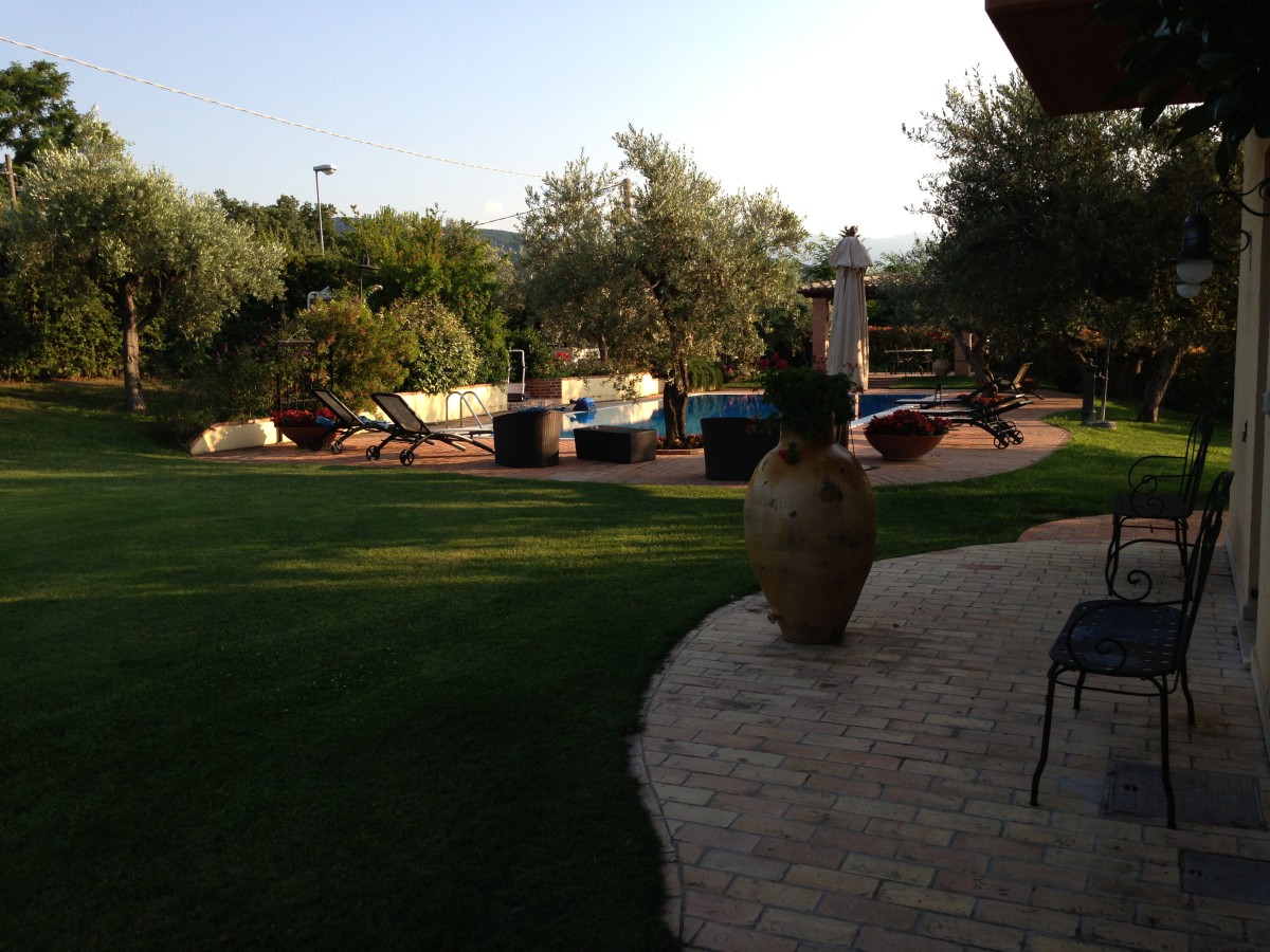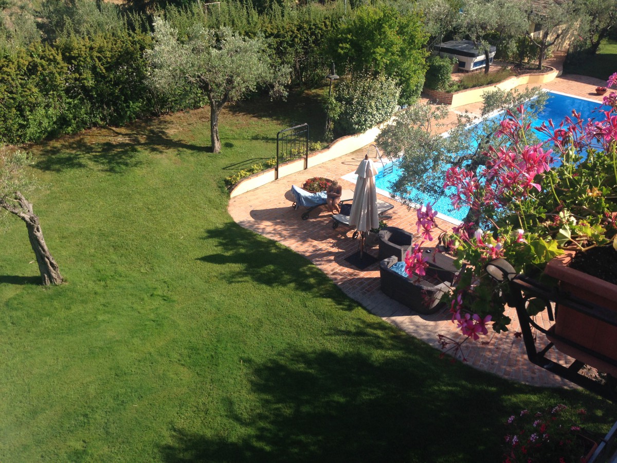 The exteriors is divided on two levels: the anterior side has a large green area where it’s possible to stay for relax times or an outdoor dinner. In this area there’s a swimming pool of 7 x 14 mts and an amazing little brick Pergola. Close to the pool there’s a solarium where is placed a maxi Jacuzzi for moments of total wellness. All around there are different varieties of colorful flowers.