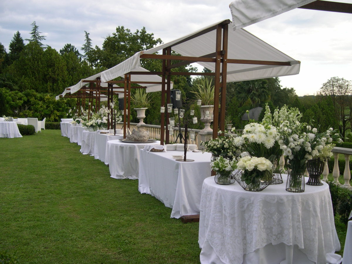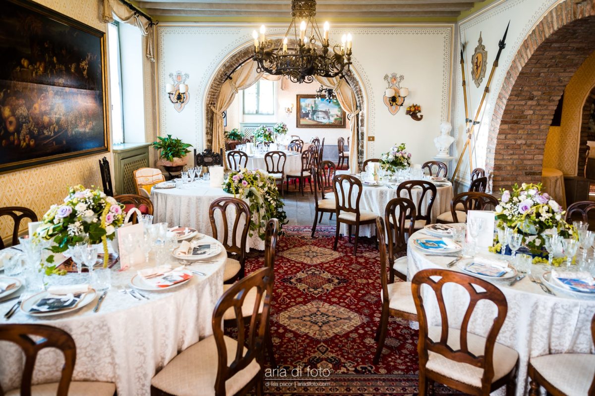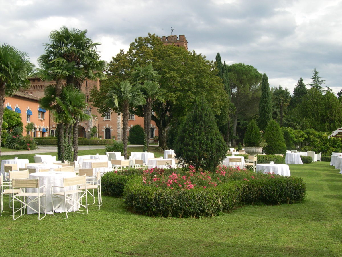 Elegantly frescoed dining rooms and a fabulous view of the castle: La Tavernetta al Castello is a venue for wedding reception that will enchant guests with its lovely atmosphere and the deliciously original dishes created for the occasion by the Chef and his team. La Tavernetta al Castello has three dining rooms and can seat up to over 100 people. The Fireplace Dining room offers a snug, intimate atmosphere, while the Frescoed Dining room and the Veranda are more generous and airy and are well suited for wedding receptions with wonderful views of the castle. The gazebos in the garden are the perfect setting for the wedding welcome aperitifs on a bright shiny day.